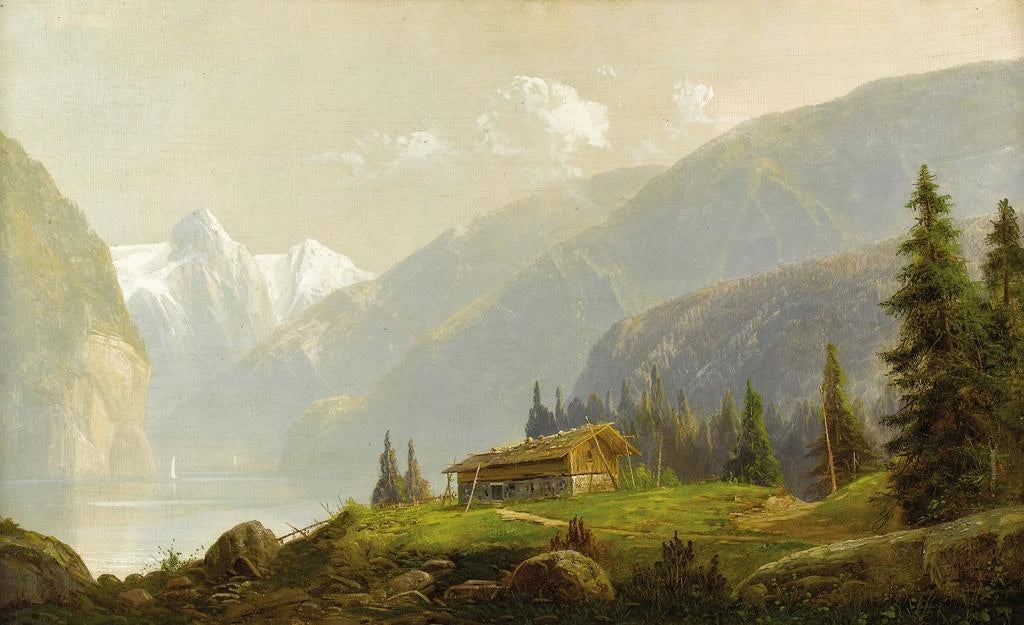 Alpe-landskab med bjerghytte - Hermann Ottomar Herzog
