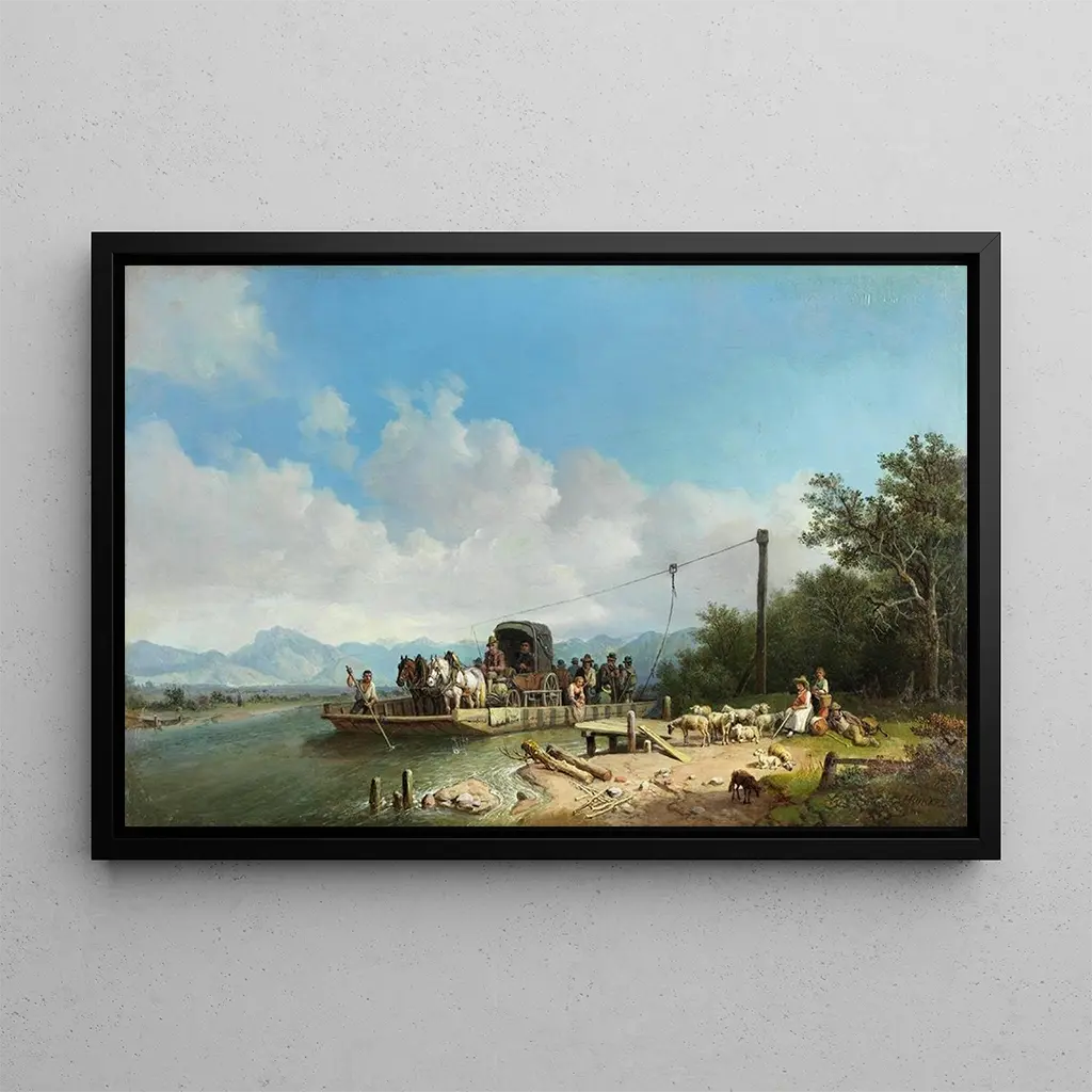 Heinrich Bürkel giver os med "Bac sur l'Inn" en livlig fremstilling af en typisk flodaktivitet. De varme og jordnære farver, kombineret med blå nuancer, fremkalder en livlig og hyggelig stemning. Den dynamiske komposition, centreret omkring færgen og dens passagerer, fanger bevægelsen og energien i scenen. Bürkel bruger en oljemaleri-teknik, der bringer figurerne og detaljerne i det omkringliggende landskab til live. Dette kunsttryk inviterer til at dykke ned i 1800-tallets dagligliv, hvor floder var vitale arterier for handel og udveksling.