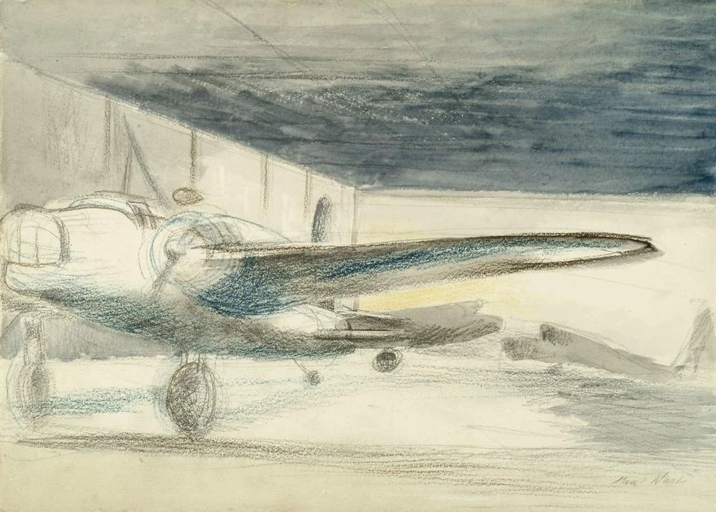 Dans "Repaire de bombardiers", Paul Nash nous plonge dans un paysage dévasté, où la nature et la technologie s'affrontent. Les couleurs sombres et terreuses dominent, créant une atmosphère pesante et mélancolique. La technique de Nash, mêlant surréalisme et réalisme, donne vie à des formes géométriques qui évoquent les bombardiers, tout en intégrant des éléments organiques. Ce tableau, à la fois puissant et troublant, invite à la réflexion sur les conséquences de la guerre et la fragilité de notre environnement.
