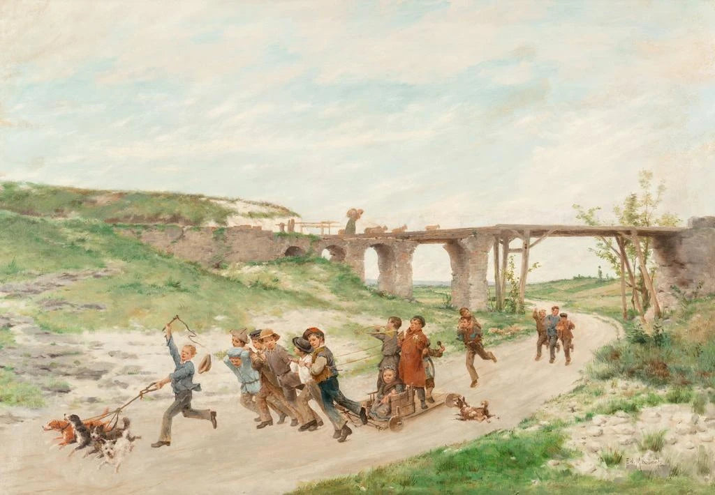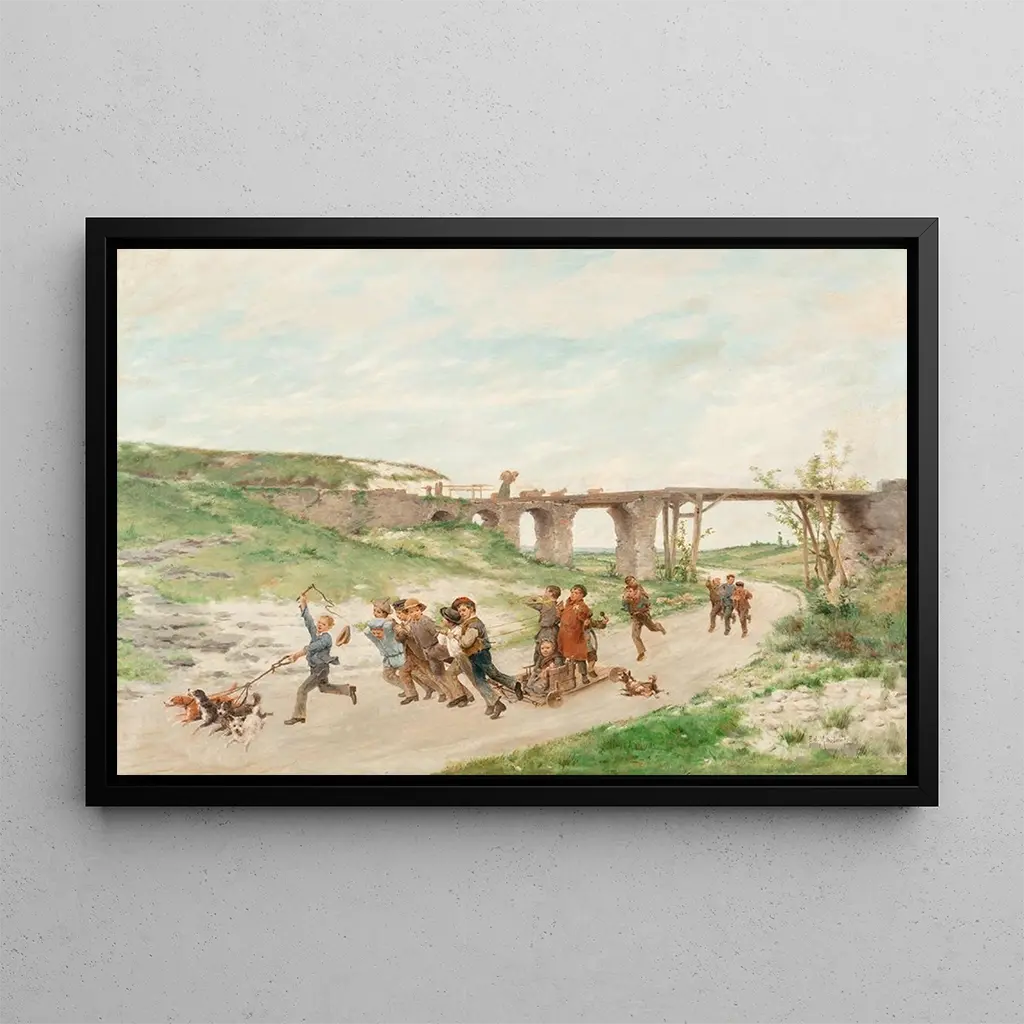 "Enfants Jouant" d'Antoine Édouard Joseph Moulinet fanger et øjeblik af ren glæde, hvor børn leger i en idyllisk ramme. De livlige farver og de muntre udtryk hos de unge hovedpersoner formidler en atmosfære af lykke og ubekymrethed. Moulinets teknik, kendetegnet ved flydende penselstrøg og særlig opmærksomhed på detaljer, skaber en levende og dynamisk kunsttryk. Dette kunsttryk fremkalder ikke blot barnets uskyld, men også skønheden i livets enkle øjeblikke, og inviterer betragteren til at genkalde sine egne barndomsminder.