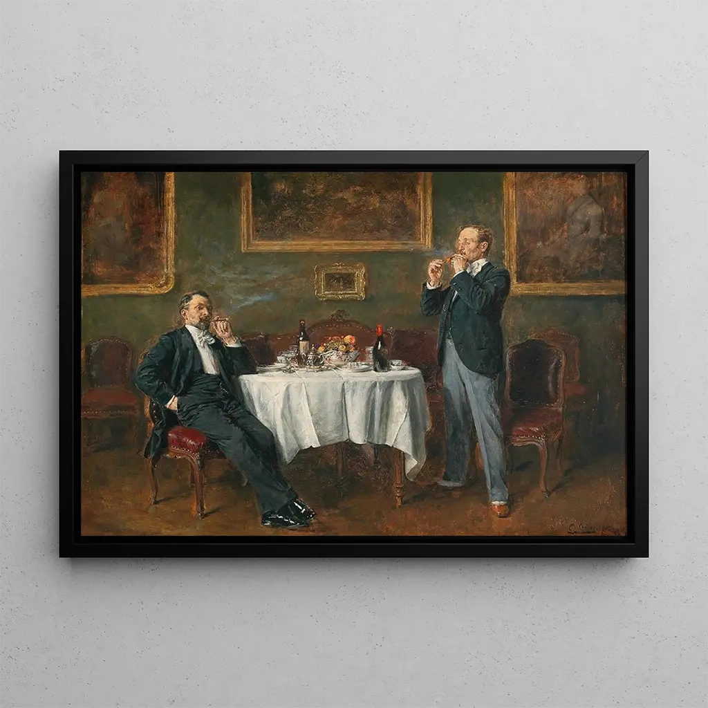 I "Cigares efter middagen" dykker Carl Wilhelm Anton Seiler ned i en varm og intim atmosfære. Dette kunsttryk, rigt på detaljer, skildrer personer samlet omkring et bord, nyder cigaretter og livlige samtaler. De varme farver, fra dybe brune til strålende guld, skaber en indbydende stemning. Seilers teknik, der kombinerer realisme og impressionistiske strejf, giver liv til hvert ansigt og hver bevægelse, hvilket inviterer betragteren til at forestille sig selv i hjertet af denne scene. Det bløde lys, der oplyser rummet, understreger den hygge, der præger dette delte øjeblik, og gør kunstværket særligt charmerende.