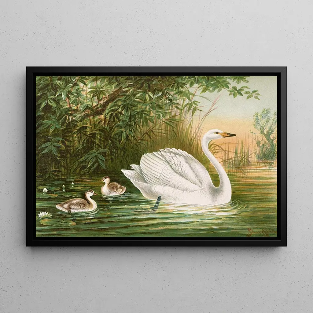 Kunsttrykket Cygnus cygnus af Johann Friedrich Naumann tager os med ind i et maleri præget af ro og ynde. Svanerne, de centrale figurer i dette værk, glider elegant over vandet, deres hvide fjer kontrasterer med nuancer af blå og grøn, der udgør det omkringliggende landskab. Akvarelteknikken, mestret af Naumann, gør det muligt at fange lyset og vandets flydendehed, hvilket skaber en fredelig og eftertænksom atmosfære. Hvert penselstrøg synes at ånde liv, og inviterer betragteren til at standse op og beundre dette flygtige øjeblik i naturen.