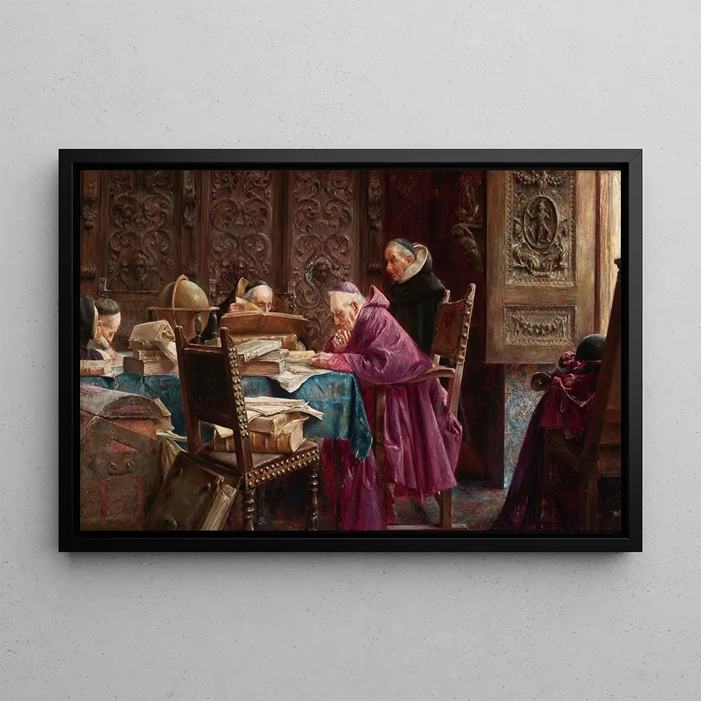 Kunsttrykket af Cardinals giver os et fascinerende indblik i det kirkelige liv, hvor de levende farver på kardinalkjolerne står i kontrast til de mørke og rige baggrunde. De minutøse detaljer i ansigterne og ornamenterne afslører en imponerende teknisk kunnen, mens den dynamiske komposition trækker blikket mod de centrale figurer. Atmosfæren i dette værk er både højtidelig og levende, og fanger essensen af en religiøs forsamling, samtidig med at den fremhæver hver kardinals personlighed. Dette maleri inviterer til refleksion over magt og spiritualitet inden for Kirken.