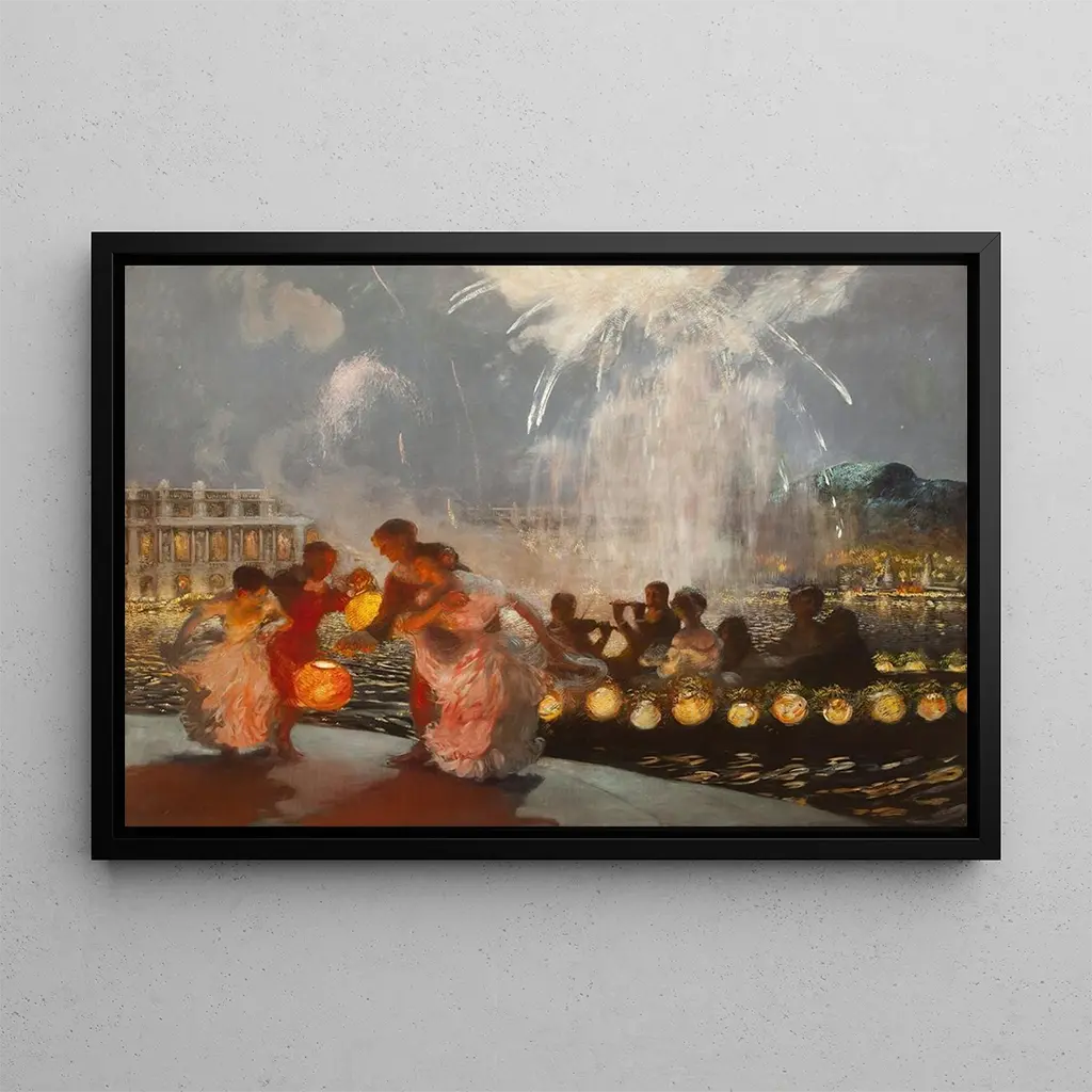 La fête joyeuse af Gaston La Touche er et livligt kunsttryk, der fremkalder glæde og ubekymrethed. Personagerne, dybt engageret i en festlig atmosfære, synes at danse til rytmen af en usynlig melodi. De strålende farver, fra dybe røde til lyse gule, blander sig harmonisk og skaber en fornemmelse af bevægelse og glæde. La Touche's impressionistiske teknik, med sine dynamiske penselstrøg, giver liv til denne scene, hvilket gør det muligt for betragteren at føle energien i festen. Kunstværket inviterer til en meditation, hvor hver detalje fortæller en historie, og hvor lyset spiller en afgørende rolle i scenografien for denne glædesfest.