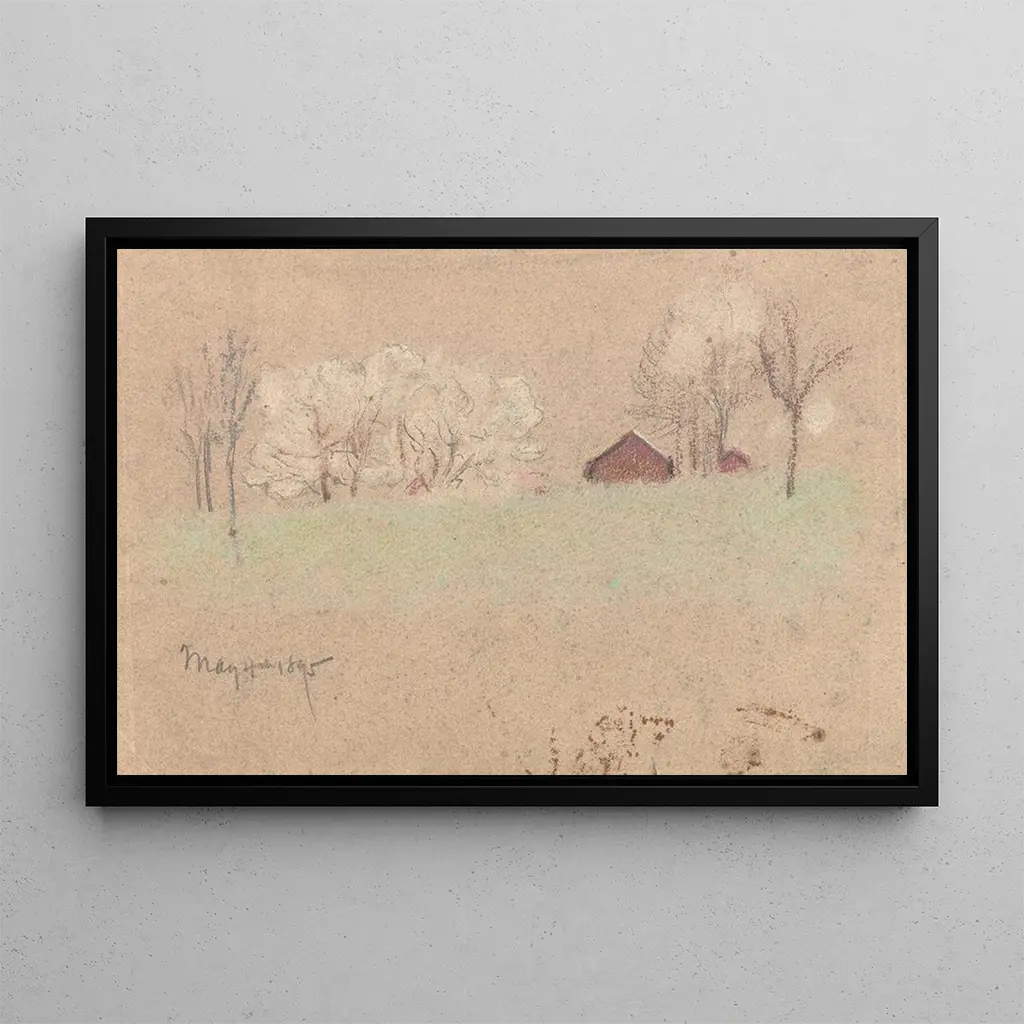 La Grange Rouge, eterbilledet af Arthur Bowen Davies, fremkalder en idyllisk scene, hvor natur og arkitektur mødes med finesse. De varme, jordnære farver, blandet med grønne nuancer, skaber en rolig og indbydende atmosfære. Kompositionen, balanceret og harmonisk, inviterer betragteren til at udforske hver detalje, fra teksturerne på bygningen til landskabets nuancer. Olie-maleteknikken giver en subtil måde at gengive lyset på, hvilket fremhæver skønheden i denne kunsttryk, der næsten synes levende. Dette værk, både enkelt og poetisk, fører blikket mod en verden, hvor tiden synes ophævet.