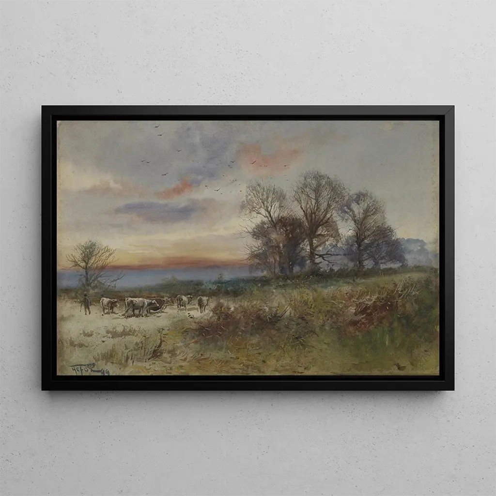 I Claygate, Surrey: et nostalgisk blik på det landlige liv Maleriet I Claygate, Surrey af Sir William Fox fremkalder en idyllisk scene præget af blidhed og ro. De varme, jordnære farver kombineret med et gyldent lys skaber en indbydende og nostalgisk atmosfære. Kompositionen, der fremhæver grønne landskaber og pittoreske huse, transporterer betragteren til et øjeblik af fred, langt fra byens travlhed. Teknikken med oljemaling, mestret af kunstneren, giver værket en rig og levende tekstur, der gør hver detalje næsten håndgribelig. Sir William Fox: en vidne til victoriansk liv Sir William Fox, britisk maler fra det 19. århundrede, er kendt for sine skildringer af det landlige liv og naturen. Hans arbejde er en del af den victorianske kunstbevægelse, hvor fokus var på skønheden i landskaber og enkelheden i dagligdagen. Påvirket af impressionisterne, formåede Fox at fange lyset og atmosfæren i sine motiver med en unik følsomhed. Hans karriere, præget af en konstant udforskning af landlighedens temaer, har gjort ham til en respekteret kunstner, hvis værker fortsat inspirerer kunstelskere. En dekorativ kunsttryk med mange fordele Kunsttrykket af maleriet I Claygate, Surrey er et dekorativt stykke, der passer perfekt ind i forskellige indretningstyper, hvad enten det er en hyggelig stue eller et inspirerende kontor. Dets idylliske skildring af den engelske landsby tilføjer et strejf af charme og ro til dit rum. Kvaliteten af kunsttrykket sikrer en enestående trofasthed til det originale værk, hvilket gør det muligt at nyde hver nuance af farve og hver detalje. Ved at vælge dette lærred tilføjer du ikke blot et kunstværk til din indretning, men også et stykke historie og kultur, der vil berige din hverdag.