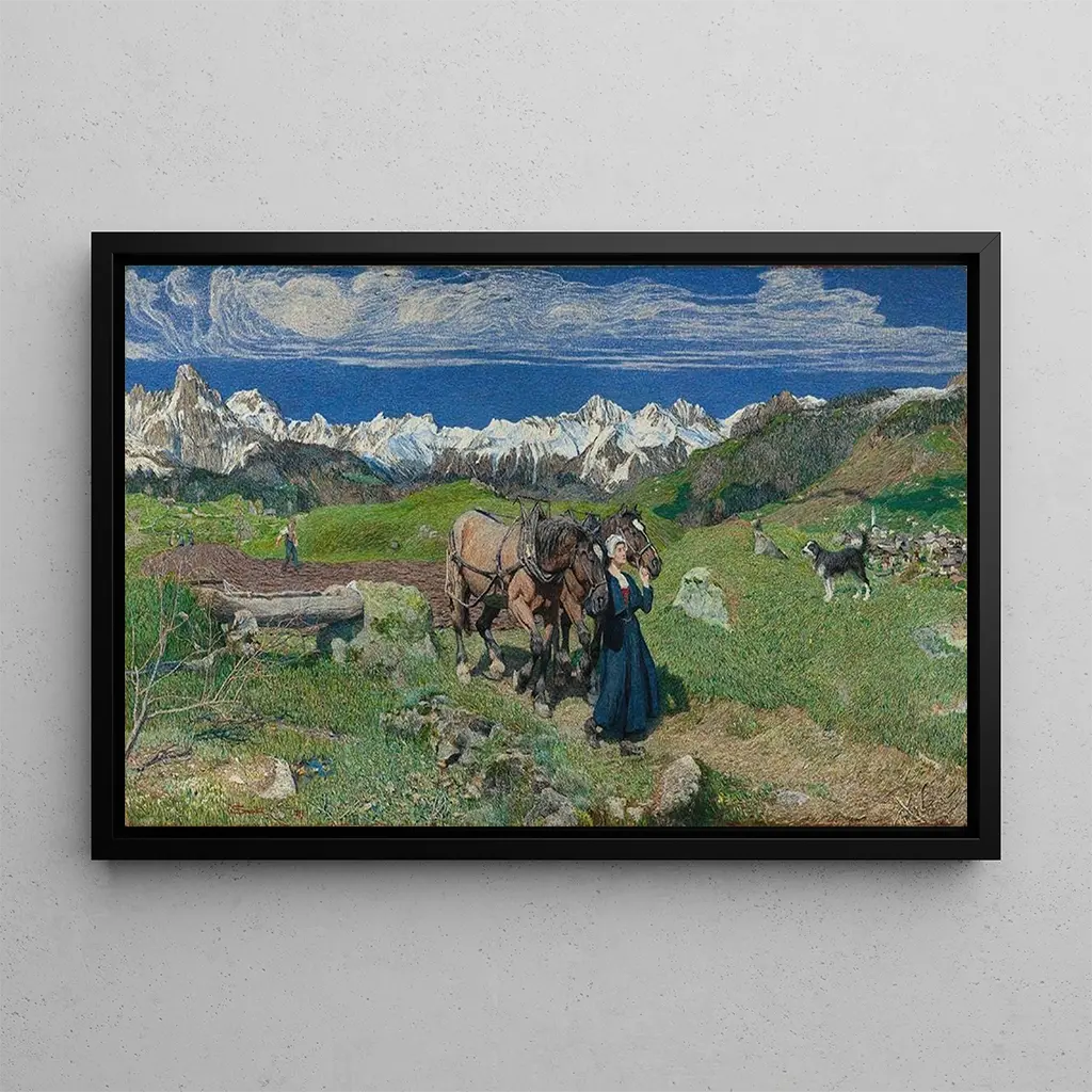 Giovanni Segantini, né en 1858, est un artiste majeur du mouvement symboliste et du divisionnisme. Influencé par les paysages alpins de son enfance, il a consacré sa carrière à explorer la relation entre l'homme et la nature. Segantini a su transcender le simple paysage pour en faire un véritable poème visuel, où la lumière et la couleur jouent un rôle primordial. Sa quête de spiritualité à travers la nature et son engagement envers la représentation de la vie paysanne ont marqué son époque, faisant de lui une figure emblématique de la peinture alpine et un précurseur de l'art moderne.