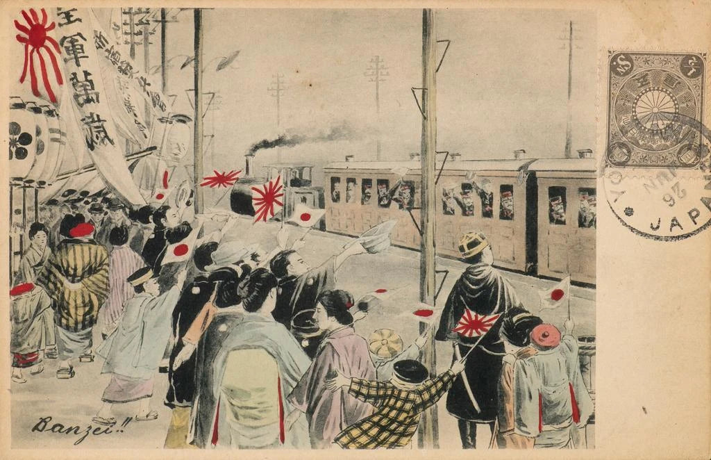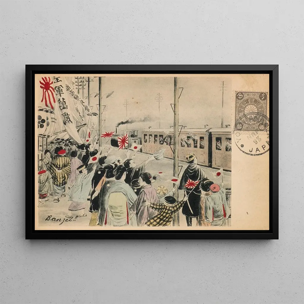 «Hourra for den kejserlige hær» fremkalder en festlig scene, hvor soldater er omgivet af en entusiastisk folkemængde. De levende farver og de omhyggelige detaljer i dette kunsttryk fanger energien og spændingen ved begivenheden. Den anvendte teknik, sandsynligvis en gravering eller litografi, formidler en dynamisk og festlig atmosfære. Ansigterne på personerne, både militære og civile, er præget af en mærkbar iver, der illustrerer den nationale stolthed og enheden i krigstid. Dette lærred, gennem sin realisme og udtryksfuldhed, inviterer til refleksion over militærets rolle i samfundet og de følelser, der omgiver det.