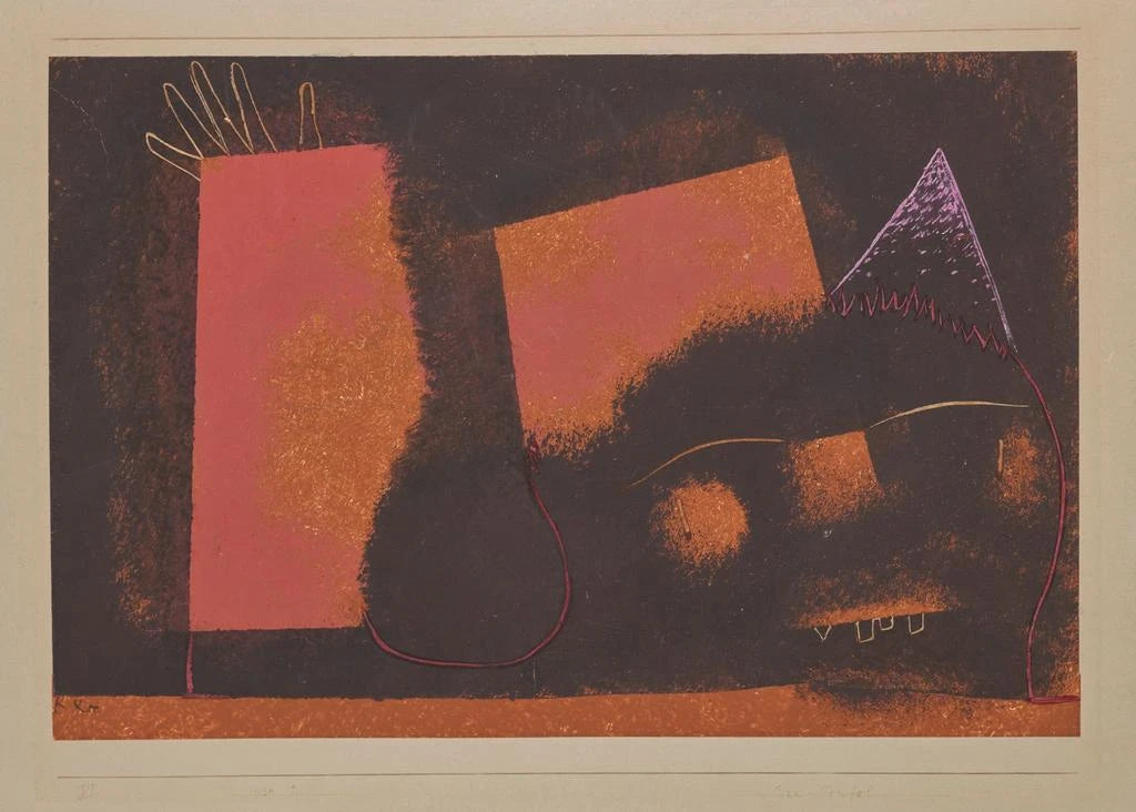 Kunsttrykket Diable de jord af Paul Klee fremkalder en drømmende verden, hvor abstrakte former blander sig med livlige farver. Dette værk, skabt med en blandet teknik, leger med nuancer af rød, blå og gul, og skaber en atmosfære, der er både legende og foruroligende. De bølgende linjer og geometriske mønstre synes at danse på lærredet og inviterer betragteren til at dykke ned i en fantasiverden. Klee, med sin unikke stil, formår at fange essensen af barndom og uskyld, samtidig med at han behandler dybere temaer relateret til menneskets natur.