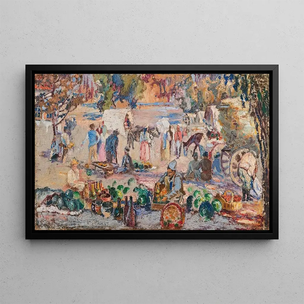 I denne kunsttryk af maleriet Marked i Krim tager Nikolai Ivanovich Kulbin os med til hjertet af en livlig scene, hvor de iøjnefaldende farver og de detaljerede elementer fanger essensen af livet på markedet. Personerne, klædt i traditionelle kostumer, travler rundt om de fyldte boder med lokale produkter, mens lyset leger over overfladerne og skaber en varm og indbydende atmosfære. Kulbins teknik, der dygtigt blander realisme med et strejf af impressionisme, giver liv til denne komposition og inviterer betragteren til at forestille sig dette sted fyldt med udvekslinger og møder.