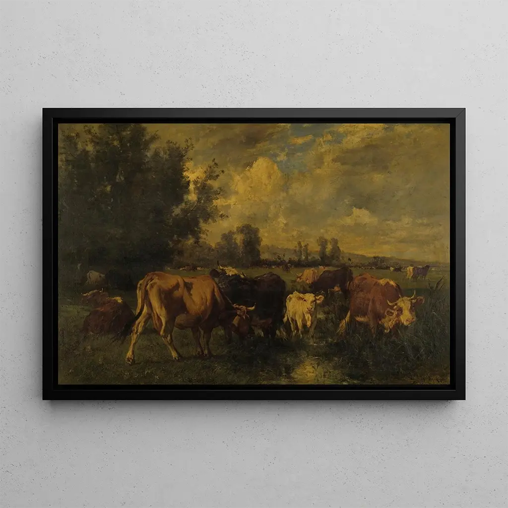 Émile van Marcke, né en 1827, est un artiste français reconnu pour ses représentations de la vie rurale et des animaux. Influencé par le réalisme et le naturalisme, il a su capturer l'essence de la campagne française à travers ses œuvres. Van Marcke a souvent peint des scènes de bétail, mettant en avant la beauté et la dignité des animaux dans leur environnement naturel. Son travail a joué un rôle important dans la représentation de la vie agricole au XIXe siècle, et Bétail dans un champ est un exemple parfait de son talent à immortaliser des moments simples mais significatifs.