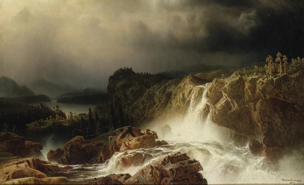 Marcus Larson, svensk maler fra det 19. århundrede, er kendt for sine romantiske landskaber, der fanger naturens skønhed. Påvirket af den romantiske bevægelse har han viet sig til at skildre scener, hvor naturen er både majestætisk og fredelig. Hans værker, ofte inspireret af hans rejser gennem Europa, vidner om en særlig følsomhed over for de nordiske landskaber. Larson har formået at forene teknik og følelse, ved at anvende fine penselstrøg for at give liv til sine visioner. Hans kunstneriske arv består, og hans malerier, som "Landskab med klippe og vandfald", fortsætter med at inspirere og forbløffe kunstelskere.