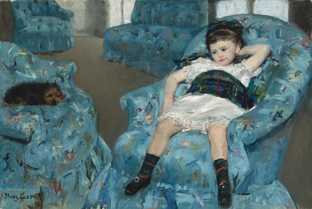 I dette delikate værk fanger Mary Cassatt uskylden og roen hos en lille pige, der sidder i en blå lænestol. Pastelfarver, domineret af nuancer af blå og rosa, skaber en blid og beroligende atmosfære. Det bløde lys, der bader scenen, fremhæver de fine træk hos barnet, mens stolen, rigt udsmykket, tilføjer et strejf af sofistikeret elegance til denne intime komposition. Teknikken med oliepaintning giver Cassatt mulighed for at lege med teksturer, hvilket gør stoffet på stolen næsten håndgribeligt og barnets hud uimodståeligt blid.