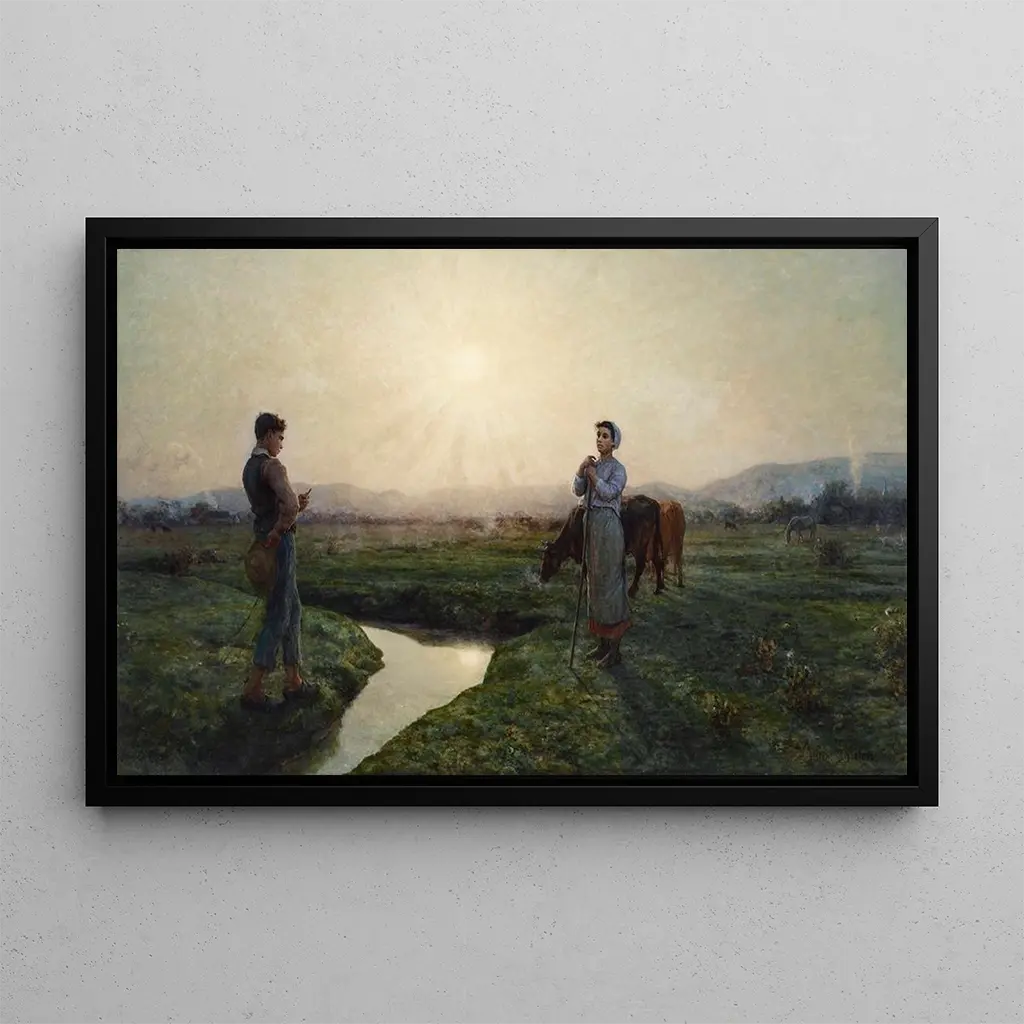 I denne kunsttryk af Le Matin fanger Jules Breton magien ved en solopgang over et landligt landskab. De varme og gyldne farver fremkalder blidheden af de første solstråler, der lyser markerne og ansigterne på de figurer, der vågner op til livet. Teknikken med oliemaling giver Breton mulighed for at lege med lys og skygge, hvilket skaber en levende og dynamisk atmosfære. De omhyggelige detaljer i tøjet og udtrykkene hos de menneskelige figurer tilføjer en følelsesmæssig dimension til denne idylliske scene, der inviterer betragteren til at føle friskheden af en lovende morgen.