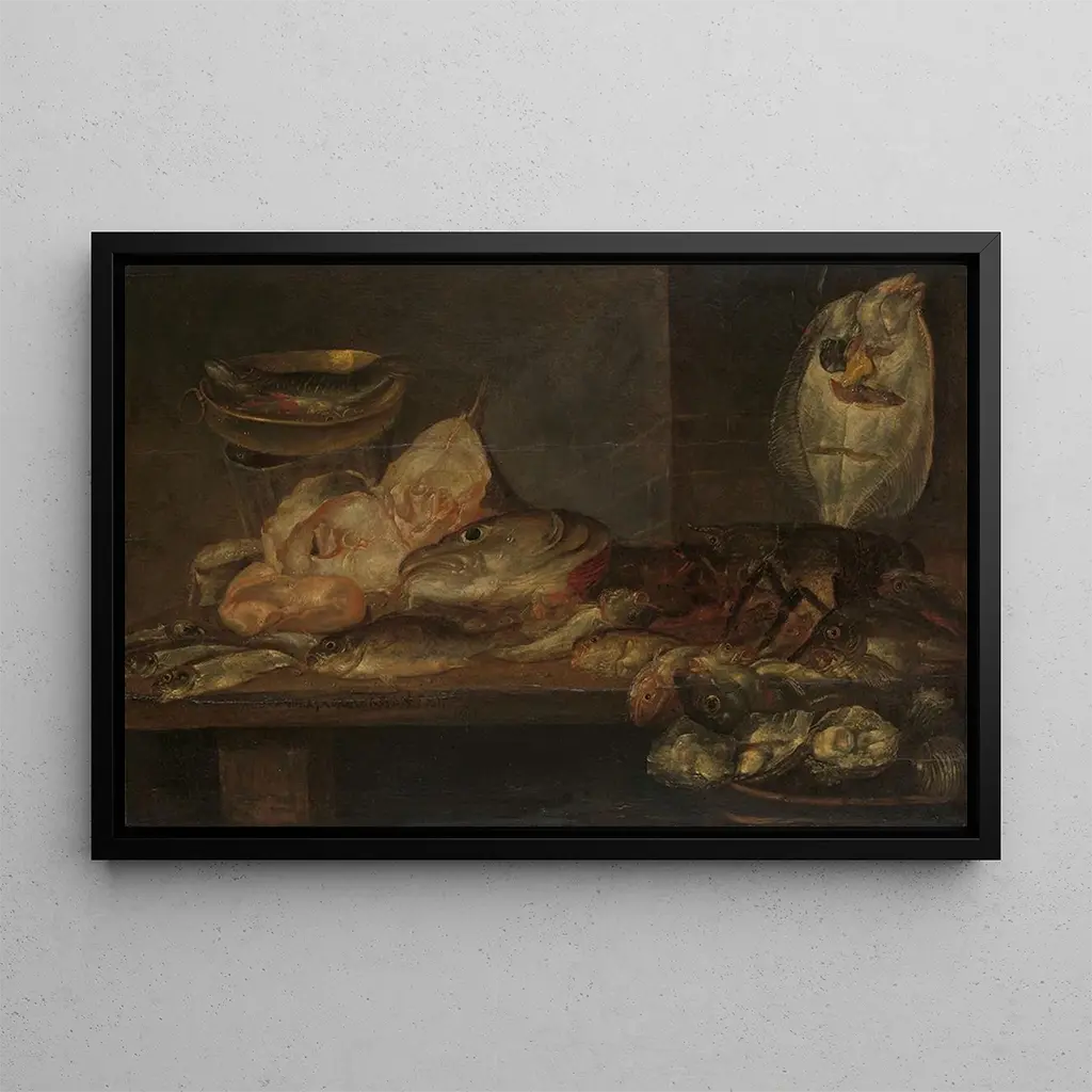 Den kunsttryk af naturtro med fisk af Alexander Adriaenssen fremkalder en verden af finesse og raffinement. De livlige nuancer af fisk, frugt og glasgenstande blander sig harmonisk, hvilket skaber en fængslende visuel sammensætning. Teknikken med clair-obscur, karakteristisk for kunstneren, fremhæver refleksioner og skygger, hvilket giver værket en næsten levende atmosfære. Hvert element synes at fortælle en historie, og inviterer betragteren til at dykke ned i denne scene af dagliglivet, hvor naturen og kunsten mødes med elegance.