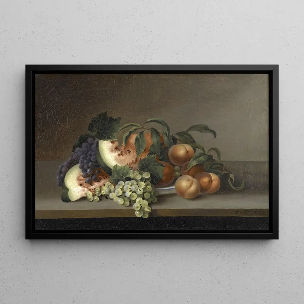 Den kunsttryk af Nature morte med vandmelon af Rubens Peale er et livligt værk, der hylder rigdommen af farver og mangfoldigheden af former. Dette lærred fremhæver en harmonisk komposition, hvor vandmelonen, hovedattraktionen, straks tiltrækker opmærksomhed med sine skinnende nuancer af rød og grøn. De andre frugter, omhyggeligt arrangeret, tilføjer et strejf af friskhed og liv til hele værket. Teknikken med oliemaling, mestret af Peale, gør det muligt at gengive teksturer med en slående præcision, hvilket skaber en atmosfære, der er både realistisk og poetisk, hvor hvert element næsten føles håndgribeligt.