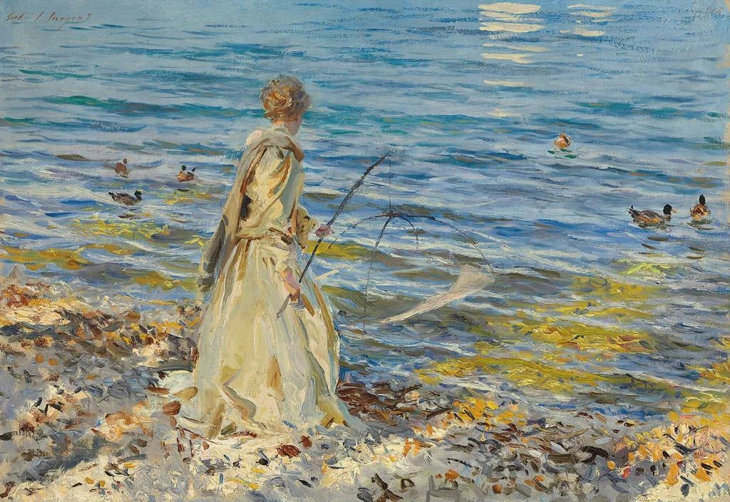 John Singer Sargent, født i 1856, er anerkendt som en af de største portrætmalere i sin tid. Uddannet i Paris, blev han påvirket af impressionisterne, men udviklede en unik stil, der kombinerer realisme og impressionisme. Sargent rejste gennem Europa og USA, og fangede scener fra dagligdagen og portrætter af indflydelsesrige personligheder. Fille pêchant, selvom mindre kendt end hans portrætter, illustrerer hans talent for at fange flygtige øjeblikke og naturens skønhed. Dette værk vidner om hans evne til at lege med lys og skygge, en essentiel egenskab ved hans arbejde.