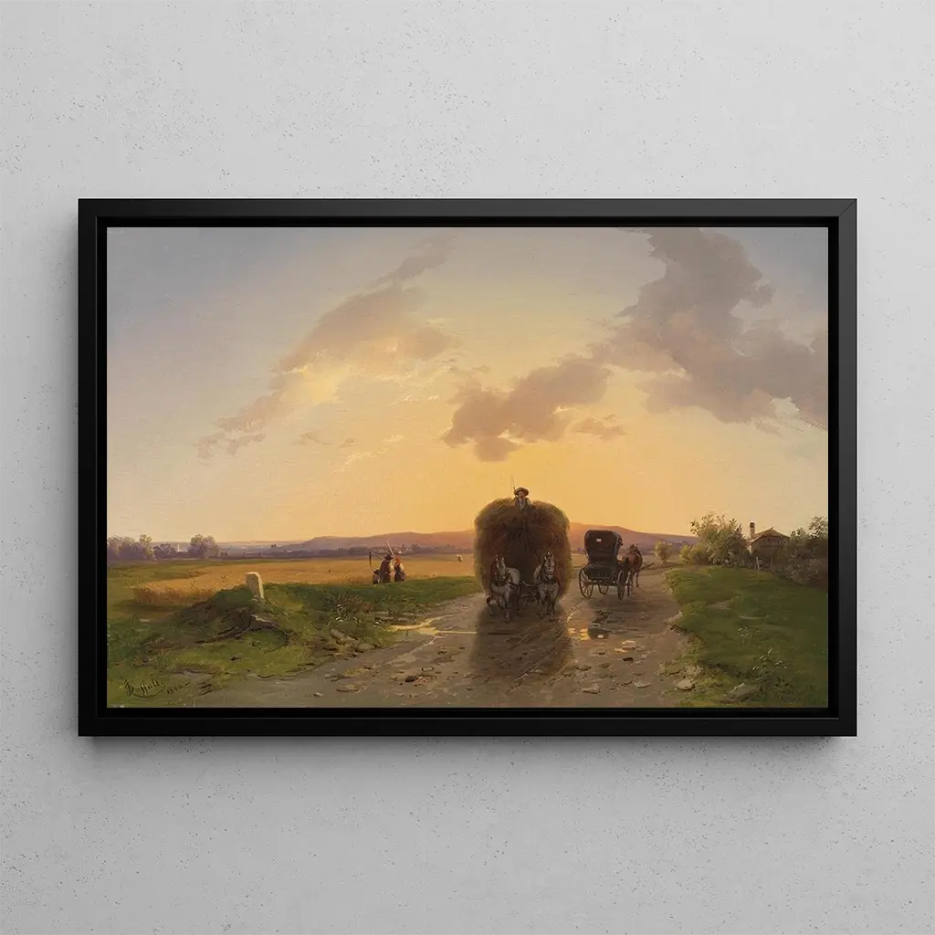 Retour du champ au crépuscule, œuvre d'Ignaz Raffalt, évoque la douceur d'une fin de journée à la campagne. Les teintes chaudes de l'orange et du violet se mêlent pour créer une atmosphère paisible, tandis que les silhouettes des paysans rentrant chez eux ajoutent une touche humaine à ce tableau bucolique. La technique de Raffalt, qui allie réalisme et romantisme, permet de ressentir la tranquillité de ce moment suspendu dans le temps. Chaque détail, des champs dorés aux nuages flottants, contribue à une ambiance sereine, invitant à la contemplation et à la nostalgie.