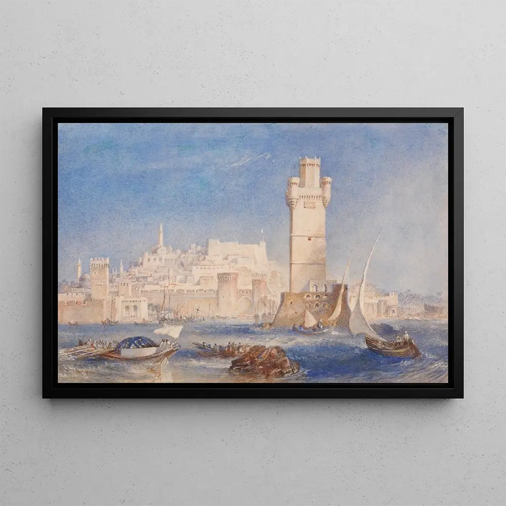 Den kunsttryk af Rhodes, et ikonisk værk af Joseph Mallord William Turner, transporterer os til solrige kyster og strålende himmelstrøg. Nuancer af blå og guld blander sig harmonisk, hvilket skaber en drømmeagtig og fredelig atmosfære. Turner, lysmester, bruger flydende penselstrøg til at fange bølgernes bevægelse og luftens blidhed. Dette lærred udstråler en følelse af ro og flugt, og inviterer seeren til at dykke ned i en verden, hvor natur og kunst flettes sammen.