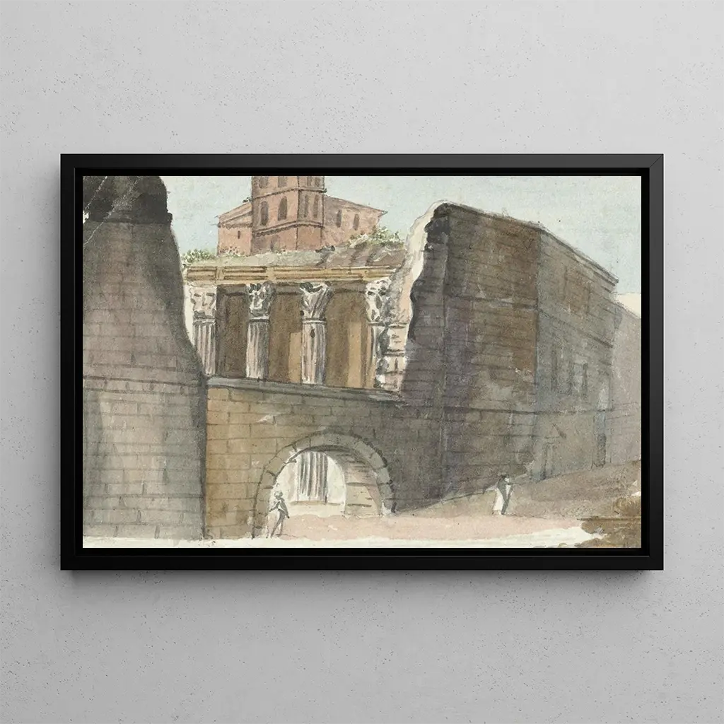 De Romaines Ruiner af Pieter Bartholomeusz Barbiers tager os med ind i en verden, hvor antikken møder naturen. Kompositionen i dette kunsttryk er domineret af imponerende arkitektoniske strukturer, omgivet af frodig vegetation. De varme, jordnære farver fremkalder en nostalgisk atmosfære, mens oljemaleriteknikken gør det muligt at fange de fine detaljer i ruinerne. Hvert penselstrøg synes at fortælle en historie og inviterer seeren til at forestille sig de liv, der engang har levet i disse steder. Hele værket udstråler en tidløs ro, som om tiden er standset for at beundre skønheden i disse levn.