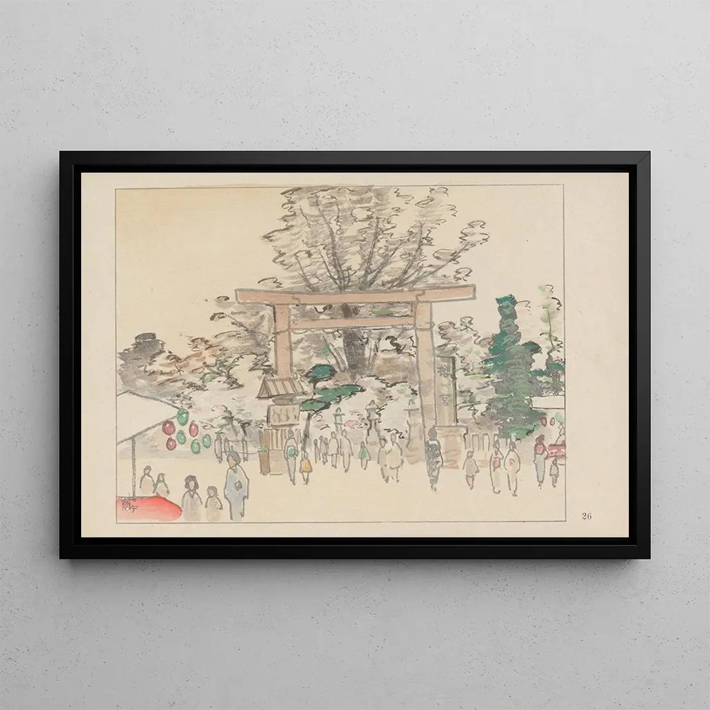 Sakuranomiya, stedet for kirsebærblomster: en blomsterdans under den japanske himmel I denne kunsttryk af Sakuranomiya fanger Akamatsu Rinsaku den flygtige skønhed af kirsebærblomster, symbol på den japanske kultur. De delikate nuancer af rosa og hvid smelter harmonisk sammen og skaber en blid og drømmende atmosfære. Kunstnerens teknik, der bruger flydende penselstrøg, giver liv til kronbladene, som næsten ser ud til at svæve i luften. Landskabet er badet i et gyldent lys, der fremkalder roen i en japansk forårsscene. Hvert detalje, fra de fine grene til refleksionerne på vandet, inviterer til fredelig eftertanke og transporterer betragteren til hjertet af dette idylliske sceneri. Akamatsu Rinsaku: en mester i japansk landskabskunst Akamatsu Rinsaku er en japansk kunstner fra begyndelsen af det 20. århundrede, kendt for sine poetiske landskaber og naturbilleder. Påvirket af japanske kunsttraditioner, er han en del af en bevægelse, der værdsætter skønheden i årstiderne og de naturlige elementer. Hans værker, ofte inspireret af ikoniske steder i Japan, vidner om en dyb forbindelse til sit miljø. Rinsaku har formået at forene traditionelle teknikker med moderne følelser, hvilket gør ham til en vigtig figur inden for japansk landskabskunst. Hans arbejde, selvom det er mindre kendt internationalt, værdsættes for sin evne til at fremkalde følelser og fejre naturens flygtige skønhed. En dekorativ kunsttryk med mange fordele Dette kunsttryk af Sakuranomiya er et ideelt dekorativt stykke til at tilføre ro til dit hjem. Uanset om det er i en stue, et kontor eller et soveværelse, fremkalder dette billede fred og naturens skønhed og skaber en beroligende atmosfære. Kvaliteten af kunsttrykket sikrer en trofast gengivelse af farver og detaljer fra det originale værk, hvilket giver mulighed for at nyde Akamatsu Rinsakus æstetik fuldt ud. Med sin visuelle tiltrækningskraft integreres dette lærred perfekt i forskellige dekorationsstile og tilføjer et strejf af elegance og kultur til dit opholdsrum.