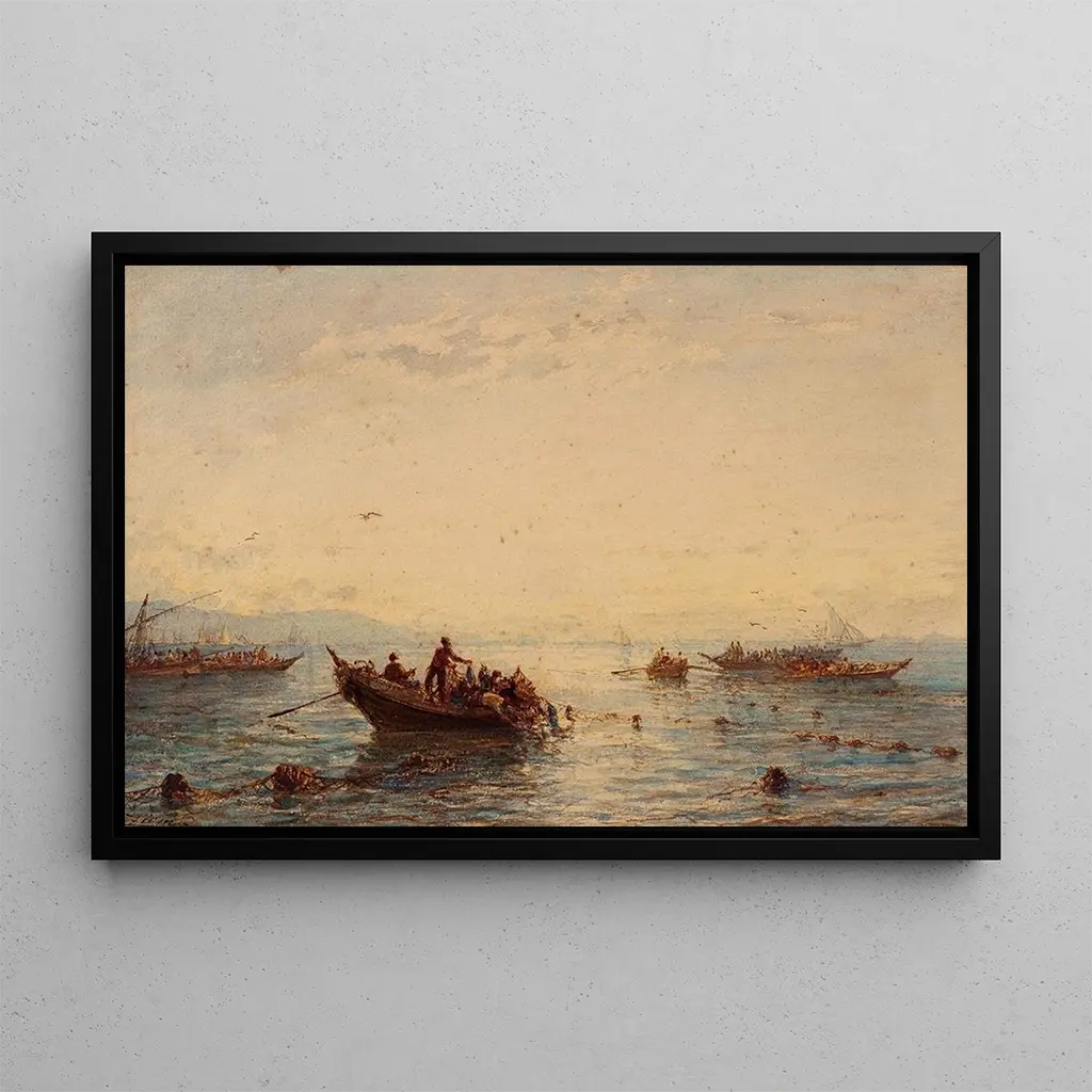 Kunsttrykket Sausset, den tunfiskefiskeri, tager os med til de solbeskinnede kyststrækninger i Middelhavet, hvor havet og himlen smelter sammen i en palette af blå nuancer og hvidt. Fiskerbådene, omhyggeligt malet, synes at danse på bølgerne, mens fiskerne arbejder med en naturlig ynde. Félix Ziems impressionistiske teknik, med sine flydende penselstrøg, skaber en atmosfære af ro og harmoni, der inviterer betragteren til at føle livets blidhed ved vandkanten.
