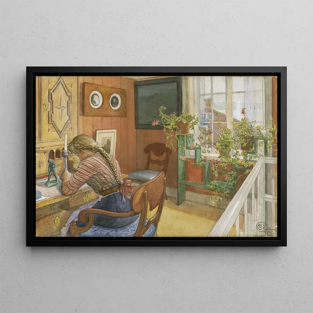 I dette delikate kunsttryk fanger Carl Larsson et øjeblik af ømhed og refleksion. Kompositionen fremhæver en kvinde, sandsynligvis en mor, der skriver breve, omgivet af en varm og lys indretning. De bløde pastelfarver, typiske for kunstneren, skaber en fredelig og intim atmosfære. Det naturlige lys, der trænger ind gennem vinduet, fremhæver de fine detaljer i møbler og genstande, hvilket inviterer betragteren til at træde ind i denne scene af liv. Hvert element synes at fortælle en historie, og man kan næsten dufte papiret og blækket.