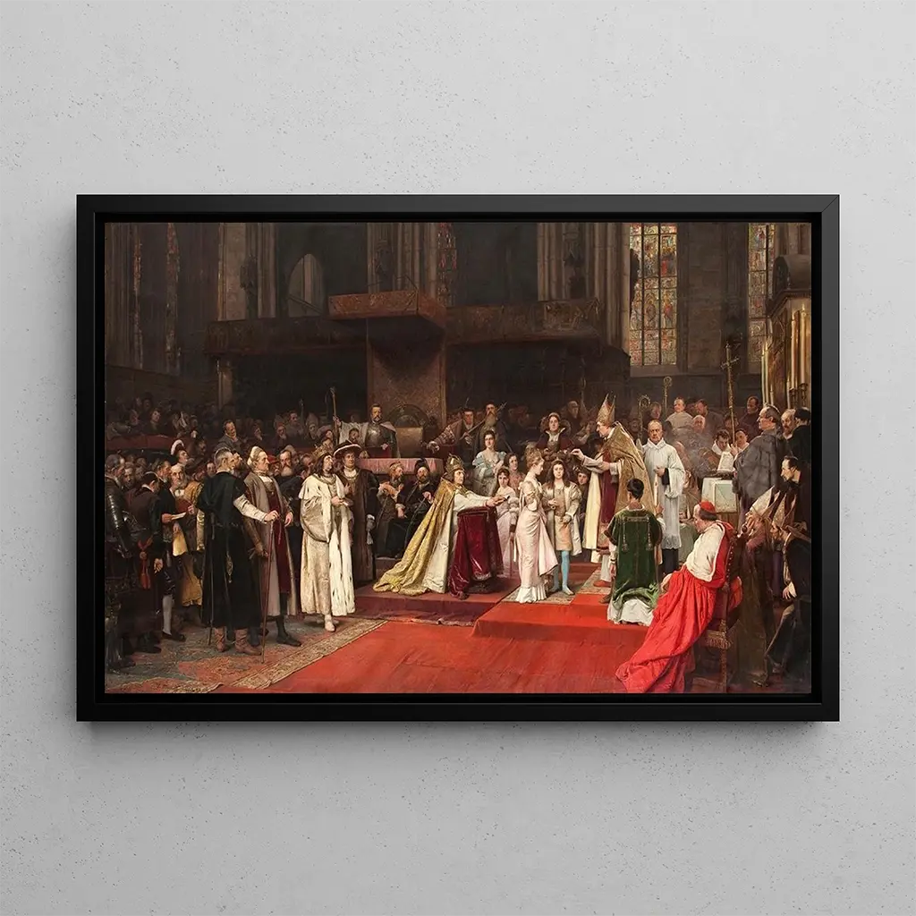 Kunsttrykket af Tu felix Austria nube af Václav Brožík fremkalder en atmosfære af sindsro og pragt. Dette værk, rigt på detaljer, viser en scene hvor det bløde lys kærtegner figurenes ansigter, hvilket skaber et fængslende spil af skygger og lys. Pastelfarver, der blander nuancer af blå, rosa og guld, tilføjer et strejf af ynde og drøm. Teknikken med oliemaling, mestret af Brožík, muliggør en bemærkelsesværdig finesse i gengivelsen af teksturer og udtryk. Hvert element i lærredet synes at fortælle en historie, og inviterer seeren til at dykke ned i en verden af fred og raffinement.