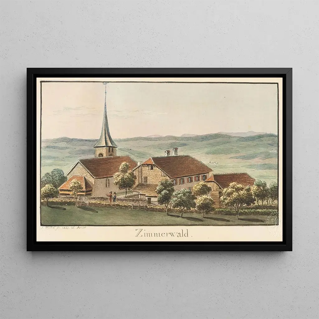 Kunsttrykket Zimmerwald af Jakob Samuel Weibel tager os med til hjertet af et bjerglandskab præget af ro. De bløde nuancer af grønne og blå farver blander sig harmonisk, hvilket vækker minder om den friske luft i de schweiziske alper. Akvarelteknikken, mestret af kunstneren, giver dette værk en let og luftig atmosfære, hvor hvert penselstrøg synes at fange lyset fra en sommerdag. De fine detaljer af træer og bjerge inviterer til en fredelig eftertanke, hvilket gør dette lærred til et ægte visuelt tilflugtssted.