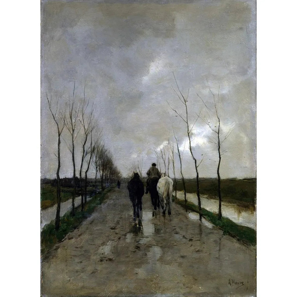 Anton Mauve, en ikonisk figur i den realistiske bevægelse i det 19. århundrede, formåede at fange det landlige liv med en unik følsomhed. Opvokset i en kunstnerfamilie blev han påvirket af tidens store mestre, mens han udviklede sin egen stil. Mauve er kendt for sin evne til at repræsentere lys og atmosfære i landskaber, hvilket har givet ham en fremtrædende plads i kunsthistorien. En hollandsk vej illustrerer perfekt hans talent, ved at blande en troværdig gengivelse af naturen med en personlig fortolkning, der transcenderer simpel realisme.