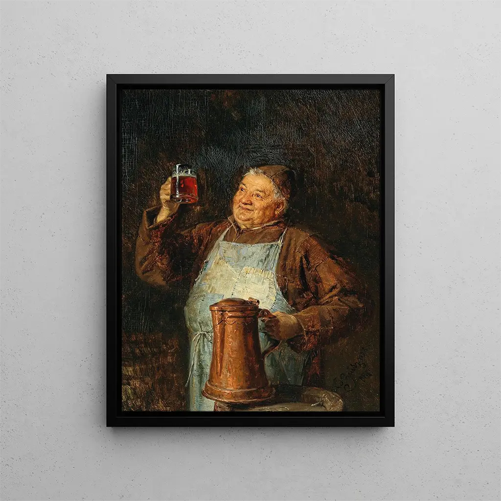 Reproduktion Biertasting - Eduard von Grützner – Fascinerende introduktion I det rige og farverige kunstunivers formår nogle værker at overskride det simple visuelle nydelse og føre os ind i en særlig atmosfære. "Biertasting - Eduard von Grützner" er et af disse værker, der gennem sin komposition og sit emne fremkalder øjeblikke af fællesskab og deling. Dette værk, både legende og raffineret, inviterer os til at udforske en verden, hvor øl bliver symbolet på en kultur og en tradition, der er dybt forankret i det europæiske samfund. Når man betragter dette stykke, transporteres seeren til en varm scene, hvor latter og samtaler flettes sammen, og dermed fejres livsglæden. Stil og særpræg ved værket Eduard von Grützners stil skiller sig ud ved sin evne til at fange øjeblikke fra dagligdagen med en bemærkelsesværdig præcision og sans for detaljer. I "Biertasting" leger kunstneren klogt med lys og skygger, hvilket skaber en varm og indbydende atmosfære. Personerne, afbildet i afslappede positurer, synes at være engageret i en livlig samtale, hvor deres ansigtsudtryk afslører en bred vifte af følelser, fra glæde til samhørighed. De varme farver, domineret af gyldne og brune nuancer, styrker denne atmosfære af fællesskab. Von Grützner nøjes ikke med blot at male en simpel scene af tasting, han indfanger et øjeblik af deling, en fejring af venskab og godt humør. Kunstneren og hans indflydelse Eduard von Grützner, født i 1846 i Tyskland, er en maler, hvis værker ofte forbindes med skildringer af sociale scener og folkelige traditioner. Hans karriere, præget af en særlig opmærksomhed på detaljer og en følsomhed over for det menneskelige, har gjort ham kendt i kunstverdenen. Inspireret af realismen har han stræbt efter at skildre autentiske øjeblikke fra dagligdagen, samtidig med at han tilføjer et strejf af lethed og humor. Hans værker, herunder "Biertasting", vidner om en dyb forståelse for menneskelige interaktioner og et ønske om at fejre livets enkle glæder.