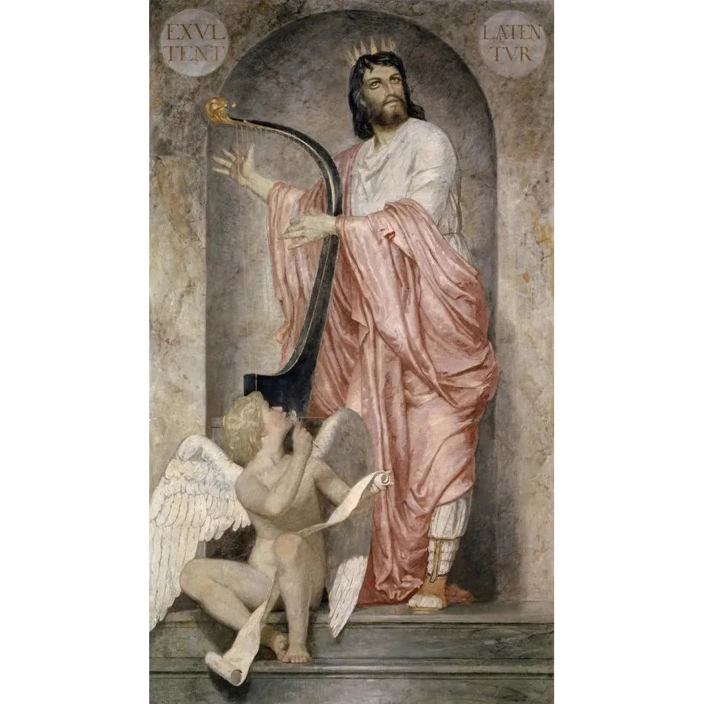 I dette fængslende kunsttryk skildrer Arnold Böcklin Kong David med en intensitet, der overskrider tidens grænser. De rige og dybe farver, der blander nuancer af rød og guld, skaber en atmosfære, der både er højtidelig og levende. Böcklins teknik, der kombinerer realisme og symbolisme, gør det muligt at føle kongens kraft og visdom. Baggrunden, med sine mystiske landskaber, forstærker ideen om en figur, der er både menneskelig og guddommelig, og inviterer betragteren til at beundre historiens storhed.