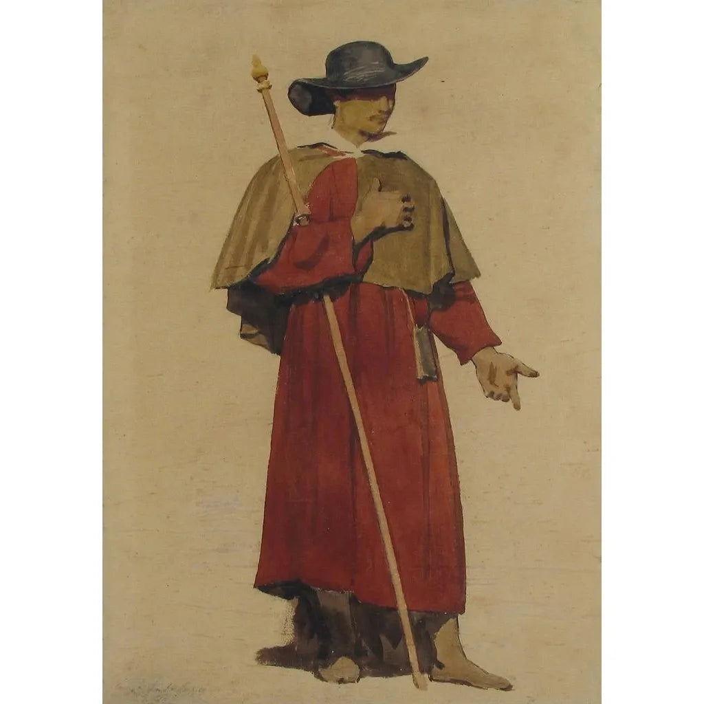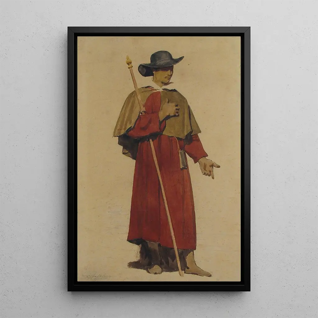 Kunsttrykket af En italiensk pilgrim fordyber os i en scene rig på følelser og symbolik. Hovedpersonen, klædt i traditionel stil, symboliserer rejsende på jagt efter mening. De jordfarvede nuancer og de fine skygger skaber en atmosfære af mystik og dybde. Teknikken med olie på lærred gør det muligt at gengive detaljerne i ansigtet og tøjet med stor præcision, hvilket understreger udtrykket af beslutsomhed og tro. Dette værk inviterer til refleksion over den indre rejse og de åndelige aspirationer, samtidig med at det fanger essensen af en æra, hvor tro og rejse var tæt forbundne.