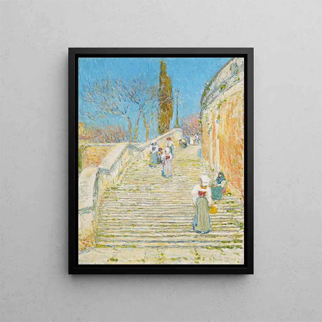 Reproduktion Place d'Espagne à Rome - Childe Hassam – Introduktion fængslende Den "Place d'Espagne à Rome" af Childe Hassam er et værk, der transcenderer det enkle billedlige ramme for at dykke ned i en levende og poetisk atmosfære. Dette maleri, emblem for den amerikanske impressionistiske bevægelse, fremkalder ikke kun Roms arkitektoniske skønhed, men også livets boblende travlhed i en pulserende by. De livlige farver og de dynamiske penselstrøg inviterer til en sensorisk udforskning, hvor hver detalje synes at ånde af lys og bevægelse. Ved at betragte dette værk bliver man ført til hjertet af den evige by, hvor kunst og liv smelter harmonisk sammen. Værkets stil og særpræg Childe Hassams stil er kendetegnet ved en dristig anvendelse af farve og lys, hvilket skaber en unik atmosfære, der gør hvert maleri til en fordybende oplevelse. I "Place d'Espagne à Rome" leger kunstneren med kontraster og chromatiske harmonier for at afspejle scenens livlighed. De dansende skygger af træerne, refleksionerne i facaderne og passanterne, der bevæger sig, er alle elementer, der væves ind i en fængslende visuel dans. Hassam, mester i impressionismen, formår at fange det flygtige, at fryse øjeblikket, mens han lader en følelse af evig bevægelse skinne igennem. Dette maleri er en hyldest til den flygtige skønhed i bylivet, hvor hvert element bidrager til en afbalanceret og dynamisk komposition. Kunstneren og hans indflydelse Childe Hassam, en central skikkelse i den amerikanske impressionisme, har formået at gøre sig gældende på den internationale kunstscene takket være sin nyskabende tilgang og sin unikke følsomhed. Inspireret af de store europæiske mestre har han udviklet en stil, der er hans egen, og som blander tradition og modernitet. Hans kærlighed til lys og farve har ført ham til at udforske forskellige temaer, fra byliv til idylliske landskaber. Hassam spillede også en væsentlig rolle i promoveringen af impressionismen i USA, hvilket bidrog til fremkomsten af en ny generation af kunstnere. Hans arbejde har haft en varig indflydelse på udviklingen af moderne kunst, og hans arv fortsætter med at inspirere mange nutidige skabere.