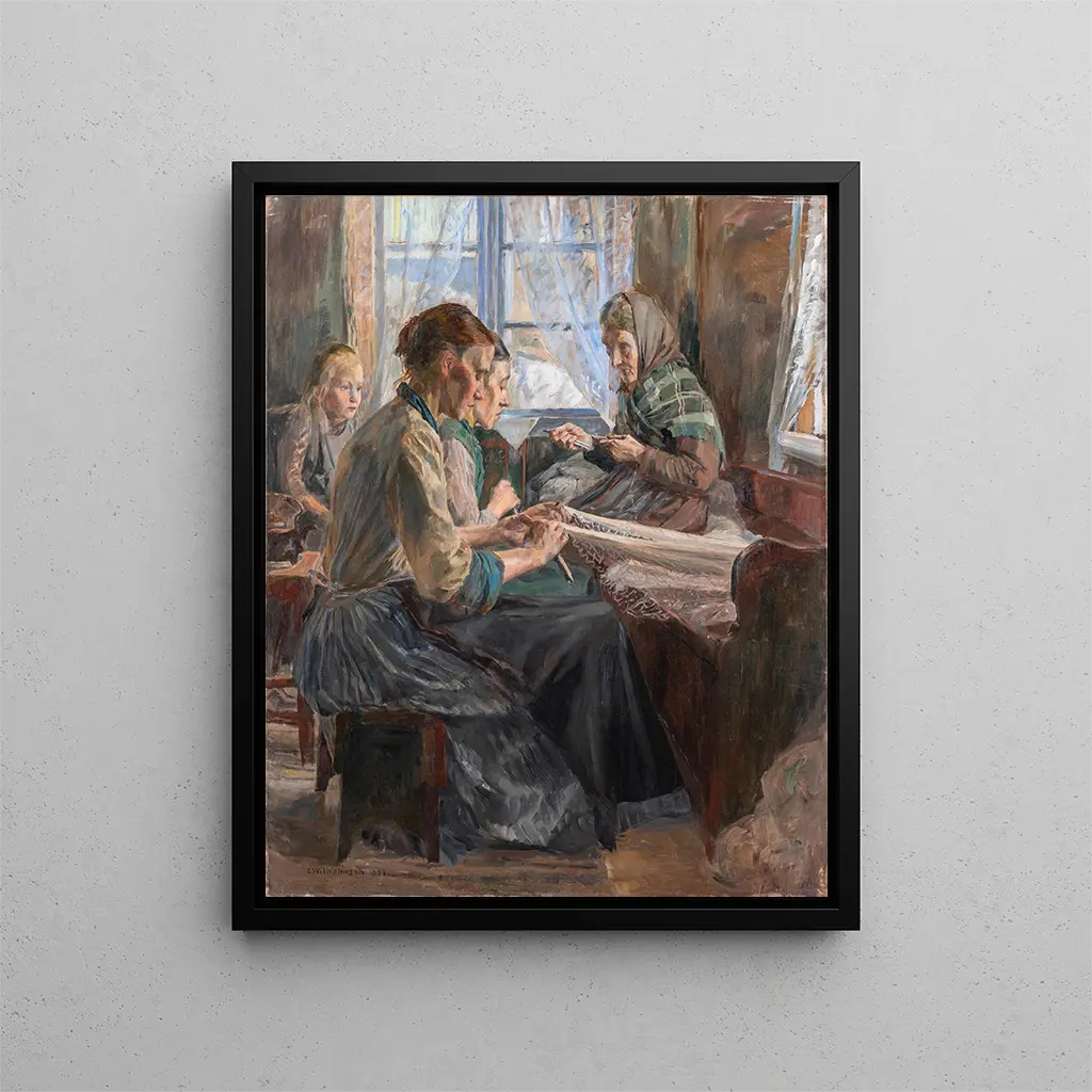 Reproduktion Pêchefolk, der laver net i Bohuslän - Carl Wilhelmson – Fascinerende introduktion I det svenske kunstlandskab i begyndelsen af det 20. århundrede skiller Carl Wilhelmson sig ud med sin evne til at fange essensen af hverdagslivet gennem intime scener. Værket "Pêchefolk, der laver net i Bohuslän" er en rørende vidnesbyrd om forholdet mellem menneske og natur samt en fejring af håndværksarbejde. Wilhelmson bruger bløde farver og delikate lys, hvilket inviterer os til at dykke ned i fiskerens univers og afslører både skønheden og hårdheden i deres dagligdag. Gennem dette kunsttryk transporteres seeren til Bohusläns kyster, hvor tiden synes at stå stille, og hvor hver bevægelse fra kvinderne er præget af værdighed og håndværk. Stil og værkets særpræg Wilhelmsons værk skiller sig ud med sin realistiske tilgang, men også med en vis poesi, der udspringer af hans kompositioner. I "Pêchefolk, der laver net i Bohuslän" er de kvindelige figurer gengivet med stor opmærksomhed på detaljer, hver fold i deres tøj og hver bevægelse i deres hænder er omhyggeligt gengivet. Lyset spiller en central rolle i dette værk, idet det oplyser kvindernes ansigter, mens det skaber subtile skygger, der tilføjer dybde til scenen. Farvetonerne afspejler en naturlig palet, der minder om de maritime landskaber og de skiftende himmelstrøg i Sverige. Denne farvevalg, kombineret med en harmonisk komposition, giver værket en atmosfære, der både er rolig og dynamisk, og inviterer seeren til at beundre skønheden i det kollektive arbejde og styrken i fællesskabet. Kunstneren og hans indflydelse Carl Wilhelmson, født i 1866, betragtes ofte som en af de væsentligste repræsentanter for den svenske kunstbevægelse i sin tid. Hans kunstneriske rejse er præget af en uophørlig søgen efter skønhed i hverdagen, hvad enten det er scener fra det landlige liv eller portrætter. Påvirket af naturalismen og impressionismen har Wilhelmson udviklet en unik stil, der gør ham i stand til at transcendere den simple gengivelse og tilbyde en ægte følelsesmæssig oplevelse. Hans værk har haft en betydelig indflydelse på samtidige og har bidraget til at fremme