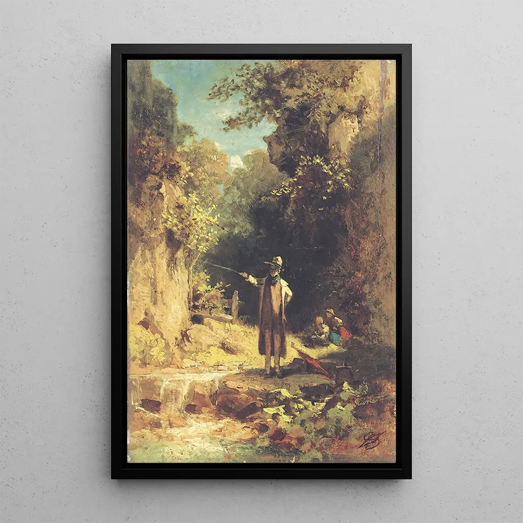 I dette ikoniske kunsttryk fanger Carl Spitzweg roen hos en fisker, der er opslugt af naturen. Maleriet skildrer en mand med en fiskestang i hånden, fortabt i sine tanker ved bredden af en fredelig flod. De bløde farver og nuancer af grøn og blå fremkalder en fredelig atmosfære, mens det naturlige lys blidt oplyser scenen. Spitzwegs teknik, der kombinerer realisme og romantik, skaber en visuel harmoni, der inviterer til eftertanke. Hvert detalje, fra refleksionerne i vandet til de omkringliggende blade, bidrager til indtrykket af ro og forbindelse med naturen.
