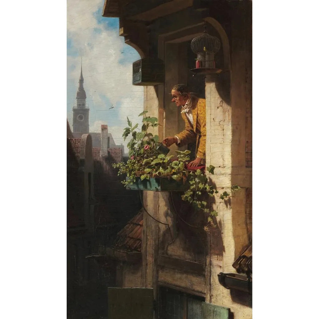 Carl Spitzweg, en ikonisk skikkelse inden for tysk romantik, formåede at fange essensen af dagligdagen gennem sine kunstværker. Født i 1808, blev han påvirket af romantikkens bevægelse, der værdsatte naturen og de menneskelige følelser. Spitzweg begyndte sin karriere som amatørmaler, mens han arbejdede som apoteker, hvilket gav ham mulighed for at observere livet fra forskellige vinkler. Hans malerier, ofte præget af humor og varme, afspejler en tid, hvor individet søgte at genfinde forbindelsen til naturen og sine egne aspirationer. "La mansarde I" er et perfekt eksempel på hans unikke stil, der kombinerer realisme og poesi.
