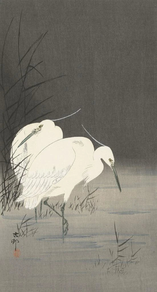 Ohara Koson, aktiv i begyndelsen af det 20. århundrede, er anerkendt som en af mestre inden for japanske kunsttryk, især i ukiyo-e-stilen. Hans værk skiller sig ud ved en særlig opmærksomhed på natur og dyreliv, påvirket af japanske kunstneriske traditioner, samtidig med at det integrerer moderne elementer. Koson har formået at fange essensen af sin tid, præget af sociale og kulturelle forandringer, samtidig med at han har bevaret naturens tidløse skønhed. Hans værker, herunder "Deux aigrettes dans les roseaux", er vidnesbyrd om hans talent og engagement i kunsten, og de fortsætter med at inspirere kommende generationer.