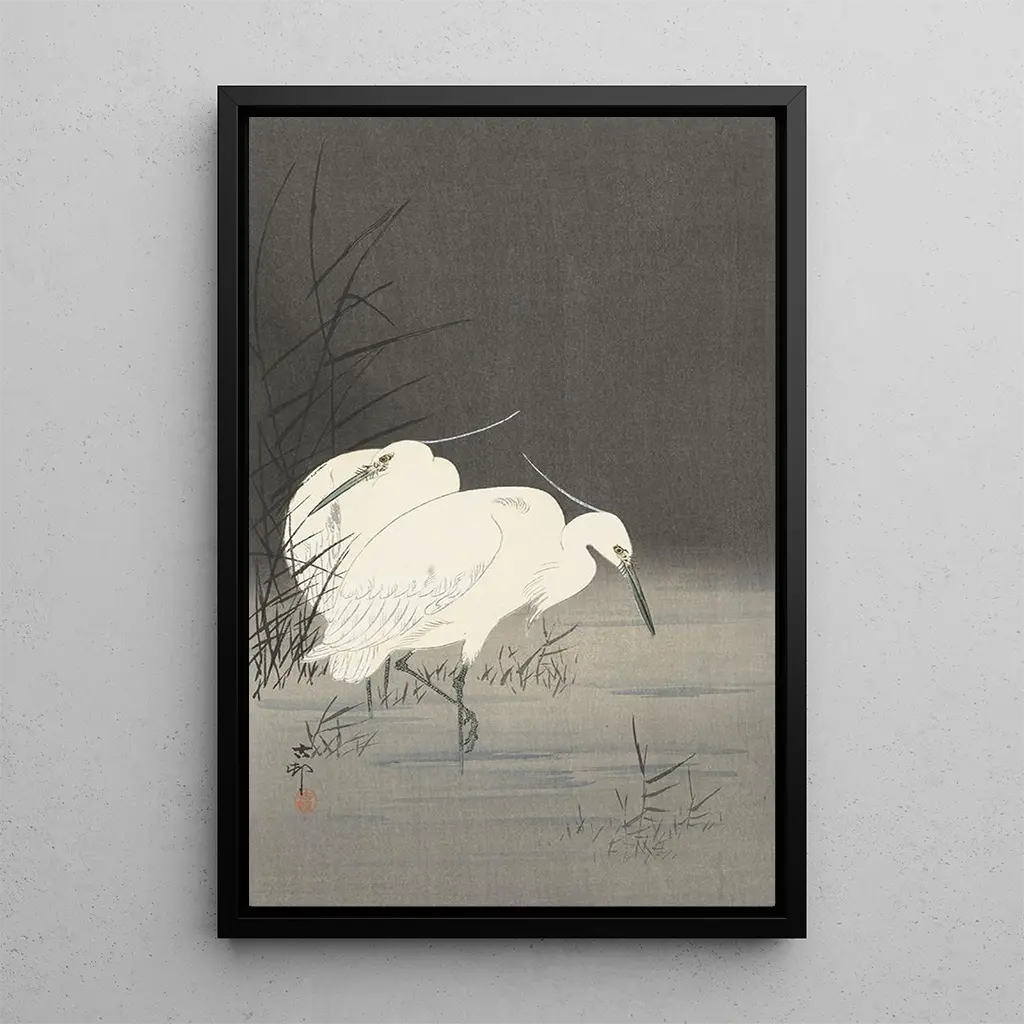 Kunsttrykket "Deux aigrettes dans les roseaux" af Ohara Koson fremkalder en fredelig scene, hvor naturen udtrykker sig i al sin pragt. Ænderne, majestætiske og yndefulde, står blandt sivene og skaber et levende billede, der inviterer til eftertanke. De bløde nuancer af grøn og beige, kombineret med fuglenes delikatesse, formidler en atmosfære af ro og naturlig skønhed. Teknikken med træsnit, mestret af Koson, gør det muligt at gengive hver detalje med finesse, hvilket giver en rig og beroligende visuel oplevelse, der transporterer betragteren til en verden af ro.