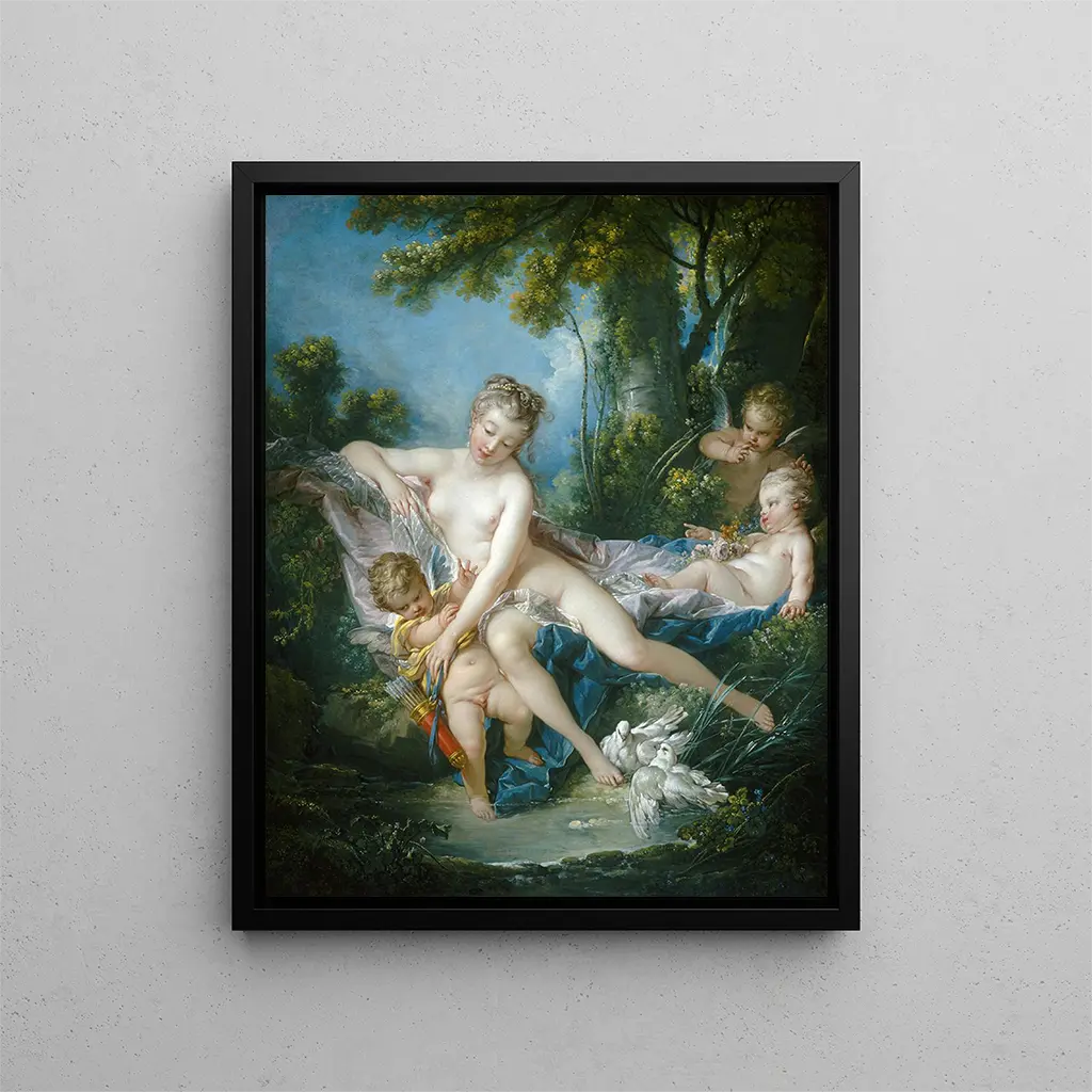 Reproduktion Le bain de Vénus - François Boucher – Indledende fængslende I den flamboyante rococo-verden skiller "Le bain de Vénus" af François Boucher sig som et ikonisk værk, hvor sensualitet og skønhed forenes i en perfekt harmoni. Dette lærred, malet i det 18. århundrede, fordyber seeren i en verden af nydelse og elegance, hvor kærlighedens gudinde afslører sig i al sin pragt. De delikate nuancer og de raffinerede kompositioner fra Boucher fanger ikke kun essensen af mytologien, men også ånden fra en æra, hvor kunsten var et spejl af livets fornøjelser. Ved at betragte dette værk transporteres man straks til en drømmehave, hvor naturen og det guddommelige væves sammen med ynde. Værkets stil og enestående karakter François Bouchers stil kendetegnes ved en lethed og en flydendehed, der næsten synes håndgribelig. "Le bain de Vénus" illustrerer netop denne tilgang med sine pastelfarver, kurvede former og fine detaljer. Kompositionen er dynamisk, hvor hvert element er omhyggeligt arrangeret for at lede blikket mod Vénus' centrale figur. Gudinden, omgivet af nymfer, er afbildet i et øjeblik af ren intimitet, hvilket både fremkalder skønhed og sårbarhed. Lys- og skyggelege samt teksturernes rigdom giver dette værk dybde og dimension, der overskrider det simple lærred. Boucher formår at fange et flygtigt øjeblik, en pause i tiden, hvor det flygtige bliver evigt. Kunstneren og hans indflydelse François Boucher, en af de mest indflydelsesrige kunstnere i sin tid, formåede at præge kunsthistorien med sin unikke stil og sin evne til at oversætte ønsker og aspirationer i det franske samfund i det 18. århundrede. Uddannet ved den kongelige malerskole, blev han hurtigt hofets foretrukne maler under Louis XV. Hans værk går ud over blot at skildre; det indkapsler en verdensopfattelse, hvor nydelse, skønhed og sensualitet fejres. Gennem "Le bain de Vénus" formår Boucher ikke blot at male en mytologisk scene; han skaber et univers, hvor hver detalje, hver farve og hver