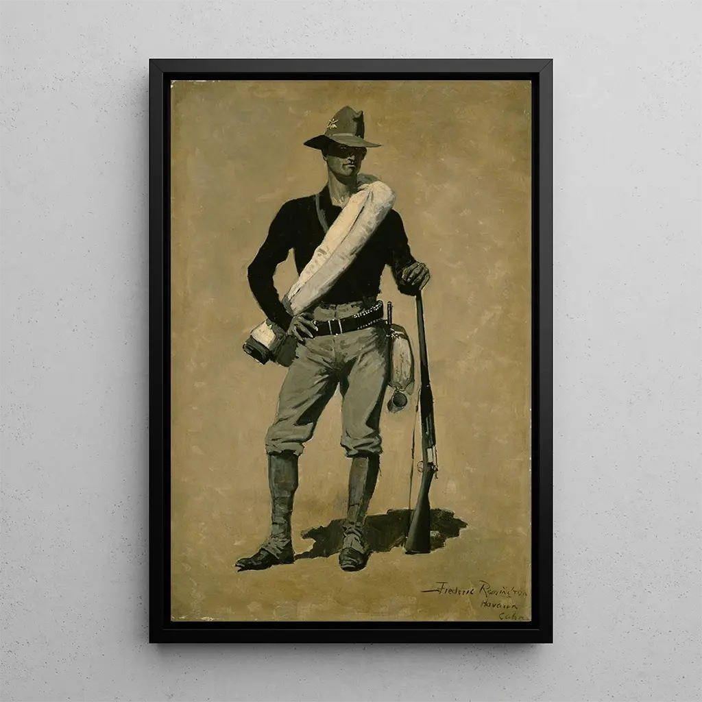 I "Soldat américain, krig i den spansk-amerikanske krig" skildrer Frederic Remington et øjeblik af mod og beslutsomhed. Lærredet, levende med varme farver og slående kontraster, fanger intensiteten af en soldats følelser i fuld aktion. Remingtons teknik, kendetegnet ved dynamiske penselstrøg, giver en fornemmelse af bevægelse, hvilket gør værket næsten levende. Dette kunsttryk fremkalder ikke kun den militære kontekst, men også den heroiske ånd, der driver dem, der kæmper for deres land.
