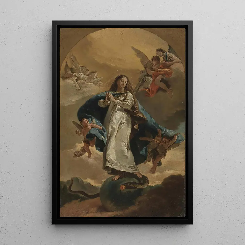"L'Immaculée Conception" af Giovanni Battista Tiepolo er et ikonisk kunsttryk, der fremkalder Jomfru Marias renhed og nåde. Lærredet udstråler en palette af delikate farver, hvor pastelltone smelter harmonisk sammen for at skabe en æterisk atmosfære. Tiepolo bruger lyslege for at fremhæve de centrale figurer, hvilket understreger deres åndelige betydning. Den dynamiske komposition og de raffinerede detaljer vidner om kunstnerens evne til at fange dybe følelser, hvilket gør dette kunsttryk fængslende og inspirerende.