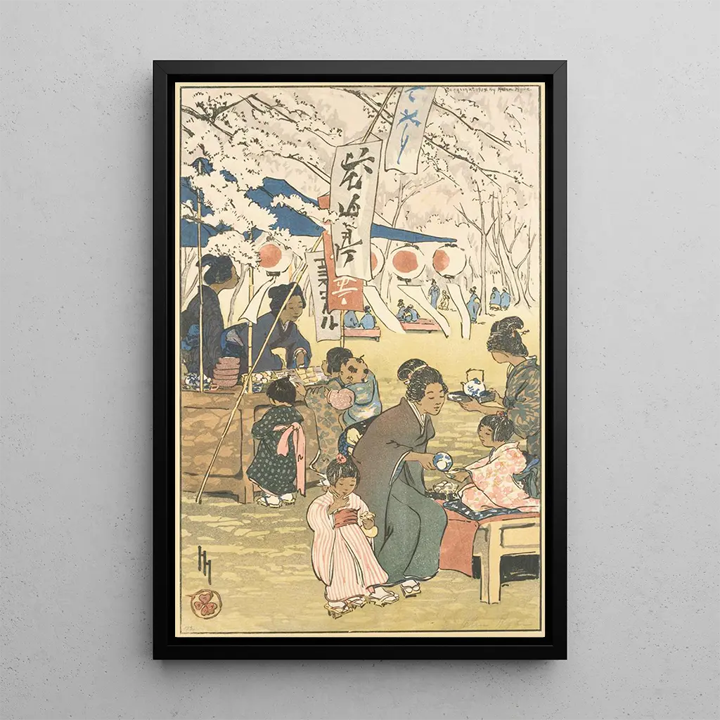 Dans "Le temps des fleurs à Tokyo", Helen Hyde capture l'essence d'un moment fugace, où la beauté des cerisiers en fleurs se mêle à la vie quotidienne. La composition délicate, avec ses teintes pastel et ses touches de rose vif, évoque une atmosphère de sérénité et de contemplation. Les personnages, souvent vêtus de kimonos traditionnels, se fondent harmonieusement dans ce paysage floral, créant une interaction poétique entre l'humain et la nature. La technique de l'aquarelle, avec ses nuances subtiles, accentue la légèreté de la scène, invitant le spectateur à s'immerger dans cette vision idyllique du Japon.