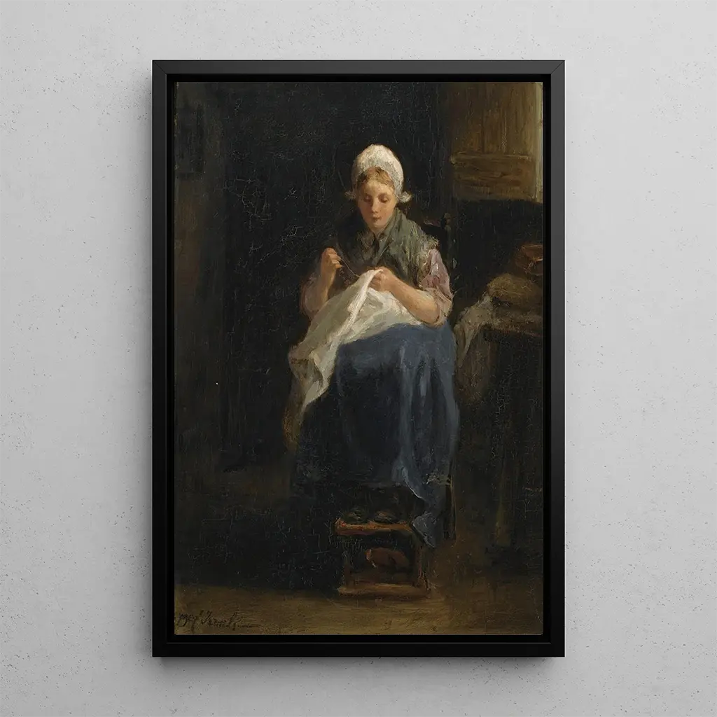 Kunsttrykket af En bonde kvinde syende af Jozef Israëls skildrer med varme enkelheden og skønheden i det daglige liv. Kompositionen fremhæver en kvinde dybt engageret i sit arbejde, omgivet af et landligt miljø, der fremkalder roen i markerne. De jordnære farver, domineret af brune og grønne nuancer, understreger scenens autenticitet. Teknikken med olie på lærred gør det muligt at fange teksturerne af stoffet og det naturlige lys, der strømmer ind i rummet, hvilket skaber en varm og intim atmosfære. Dette kunsttryk inviterer til refleksion over arbejdsindsatsen og kvinders værdighed i det landlige samfund i det 19. århundrede.