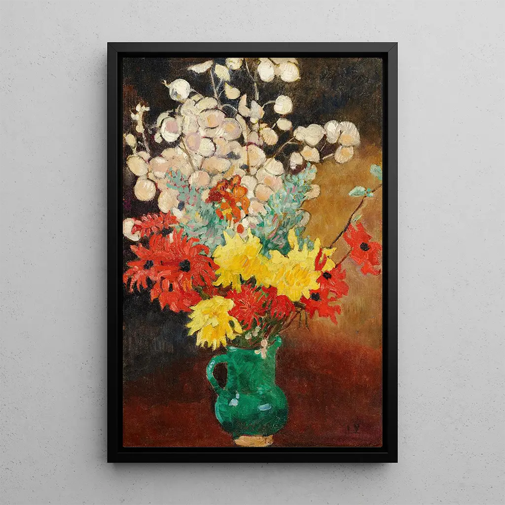 I "Cruche verte dahlias et fleurs" giver Louis Valtat os en blomsterkomposition med stor visuel rigdom. Krukken, i en strålende grøn nuance, fungerer som baggrund for en frodig buket af dahlias og andre farverige blomster. De levende nuancer og de organiske former smelter harmonisk sammen, hvilket skaber en glædelig og livlig atmosfære. Valtats teknik, kendetegnet ved hurtige og udtryksfulde penselstrøg, giver liv til hver enkelt blomst og blad, hvilket gør værket næsten håndgribeligt. Dette maleri fremkalder naturens flygtige skønhed, samtidig med at det hylder kunstnerens virtuositet.