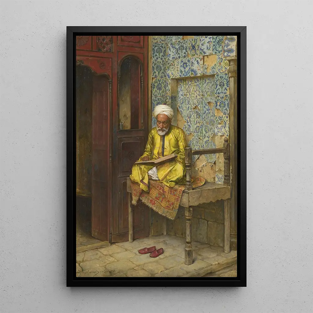 I "L'homme savant du Caire" fanger Arthur von Ferraris essensen af en intellektuel dybt engageret i refleksion. Kompositionen fremhæver en central figur, klædt i traditionelt tøj, omgivet af bøger og videnskabelige instrumenter, symboler på ældgammelt og værdifuldt viden. De varme, jordnære farver fremkalder den rige og livlige atmosfære i den egyptiske kultur, mens de omhyggelige detaljer vidner om kunstnerens tekniske kunnen. Dette kunsttryk inviterer til dyb eftertanke, hvor hvert element fortæller en historie om søgen efter viden og visdom.