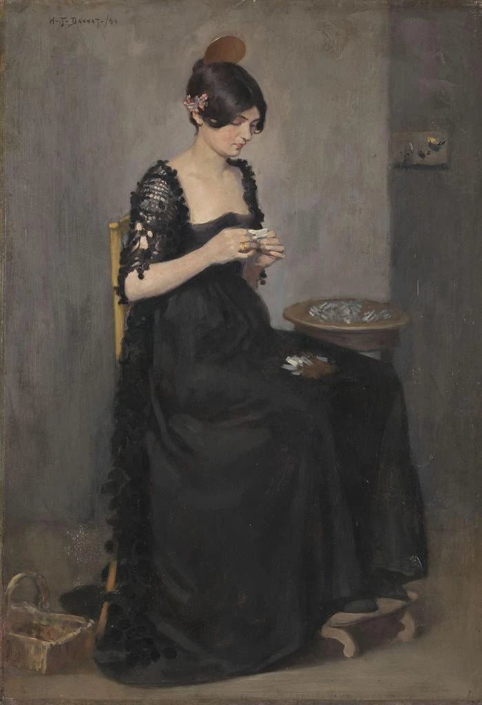 "Young girl from Spain making cigarettes" af William Turner Dannat indfanger et øjeblik af hverdagslivet med en slående finesse. Lærredet skildrer en ung kvinde fokuseret på sit arbejde, omgivet af et spil af lys, der fremhæver teksturerne i hendes hud og tøj. De varme farver, typiske for genrebilleder, skaber en intim og autentisk atmosfære. Kunstneren formår at formidle følelsen og værdigheden af sit motiv, hvilket gør dette værk både rørende og evokativt for en svunden tid.