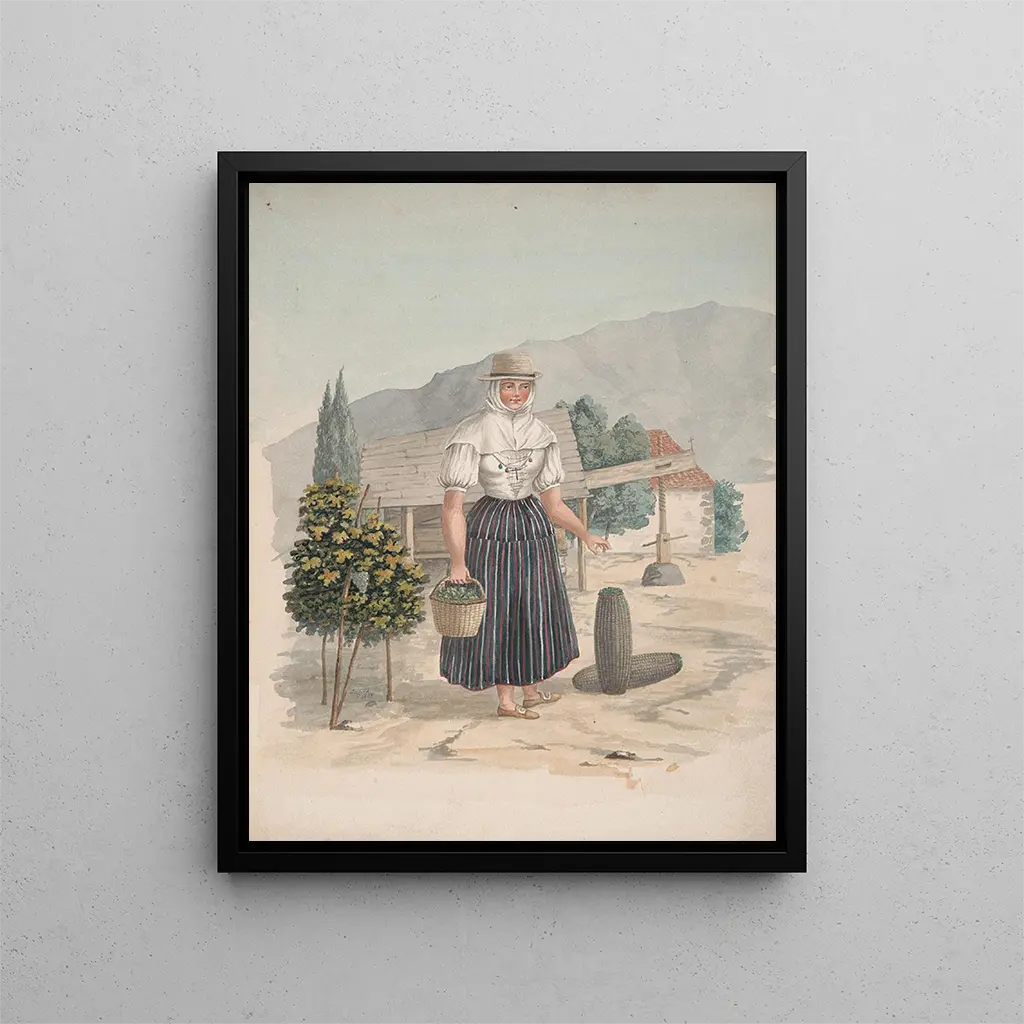 Reproduktion Femme d'El Miradero Tenerife - Alfred Diston – Introduktion fængslende I kunstverdenen overskrider visse værker den simple ramme for at blive visuelle fortællinger, åbne vinduer til forgangne epoker. "Femme d'El Miradero Tenerife" af Alfred Diston er et af disse ikoniske værker, der fanger selve essensen af kanarisk skønhed og kultur. Dette værk, levende med farver og følelser, transporterer os til hjertet af Tenerifes fortryllende landskaber, hvor natur og menneske mødes i en perfekt harmoni. Gennem dette kunsttryk inviteres seeren til ikke blot at udforske kunstnerens teknik, men også det fascinerende univers, han har formået at skabe. Værkets stil og unikhed "Femme d'El Miradero Tenerife" skiller sig ud med sin unikke stil, en subtil blanding af realisme og romantik. Diston, mester i lys og skygge, bruger en rig og varm farvepalette, der fremkalder det bløde klima på De Kanariske Øer. Den kvindelige figur, central i kompositionen, er afbildet med bemærkelsesværdig finesse. Hendes træk er både bløde og udtryksfulde, fangende en følelse, der synes at vibrere ud over tid. Lærredet begrænser sig ikke til et simpelt portræt; det fortæller en historie, nemlig om en kvinde forankret i sit miljø, i harmoni med den natur, der omgiver hende. De omhyggelige detaljer i blomster og landskaber i baggrunden tilføjer en ekstra dimension, hvilket skaber en atmosfære af ro og eftertanke. Dette maleri er en invitation til flugt, en visuel rejse, der vækker sanserne og nærer sjælen. Kunstneren og hans indflydelse Alfred Diston, britisk maler fra det 19. århundrede, er en fascinerende skikkelse i kunsthistorien. Hans værk er præget af en udforskning af temaer som kvindelighed og natur, ofte inspireret af hans rejser gennem Europa og videre. Diston har formået at fange ånden i de steder, han har besøgt, og hans passion for eksotiske landskaber afspejles i hans malerier. Hans teknik, der kombinerer præcision og følsomhed, har påvirket mange samtidige kunstnere og efterladt et varigt aftryk på den kunstneriske bevægelse i hans tid. Ved at interessere sig for kanarisk kultur har Diston også bidraget til