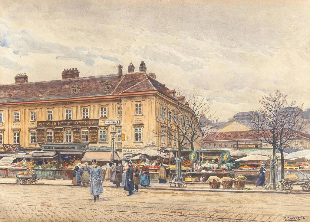 I Kejser Franz Joseph krydser Naschmarkt fanger kunstneren et præcist øjeblik af den østrigske historie, hvor kejseren, en ikonisk skikkelse, blander sig i den daglige liv på markedet. De livlige farver og de minutøse detaljer i personerne og standene skaber en levende og dynamisk atmosfære. Kompositionen er omhyggeligt orkestreret, hvilket fremhæver kejserens stature, samtidig med at den integrerer bevægelsen af handlende og kunder. Dette kunsttryk fremkalder ikke blot en begivenhed, men også den travlhed, der kendetegnede en æra, hvor monarkiet var i kontakt med folket.