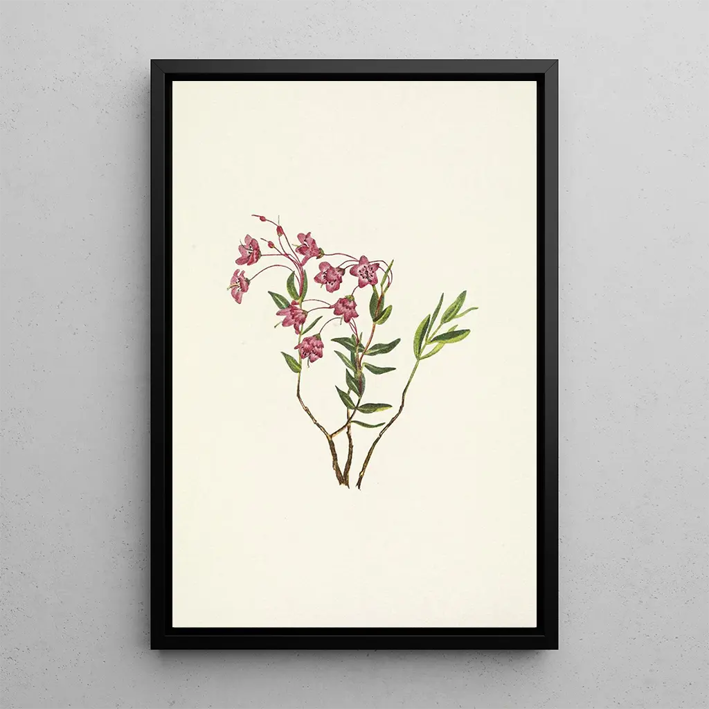 Kalmia des montagnes Rocheuses kunsttrykket, skabt af Mary Vaux Walcott, tager os med ind i en blomsterverden med slående skønhed. Dette værk fremhæver finheden af Kalmia microphylla-blomsterne, med nuancer, der spænder fra bleg rosa til dyb violet. Akvarelteknikken, som kunstneren anvender, giver lethed til kompositionen, mens de fine detaljer i kronblade og blade fanger essensen af denne ikoniske plante fra Rocky Mountains. Atmosfæren, der udspringer af dette maleri, minder om en gåtur i den vilde natur, hvor hver blomst synes at vibrere i takt med vinden.